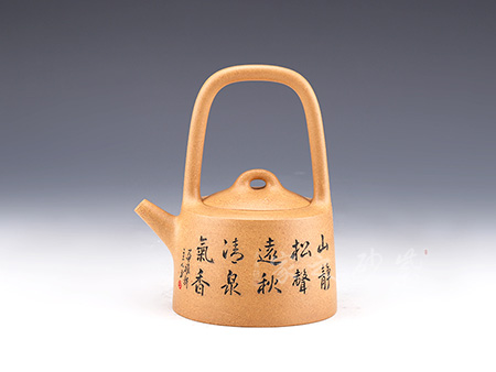 壶身与提梁比例各半,由下至上形成近梯型状,中间由肩上圆弧和隆起的半圆盖,高高的桥塑钮加以 变化、缓冲,配上长直嘴,显得通壶精气有神,线条交待清晰明确,提梁内圆外方与壶身衔接自然有度,再配以诗词更添雅趣。