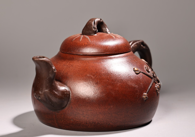 带有官窑年号款识的紫砂器应是当时宜兴地方官入贡宫廷的御用器,有的是宫廷出样传旨让宜兴定烧的,有的是进呈素坯在造办处二次加工处理的,工序包括:包漆皮、烧器座、加绘金彩、堆粉等。这批进贡宫廷的东西,从坯泥的精炼程度、制器的工艺手段、装饰的题材内容来看,都显示出一种超尘脱俗的皇家气派,其真实可信的程度是不容置疑的。另外还有一部分精致优良的茗壶,从里到外光素无纹,质地、工艺都堪称一流,并没有任何款识和标记,此类制品技艺超群,也应归并于宫廷用具的范畴。
