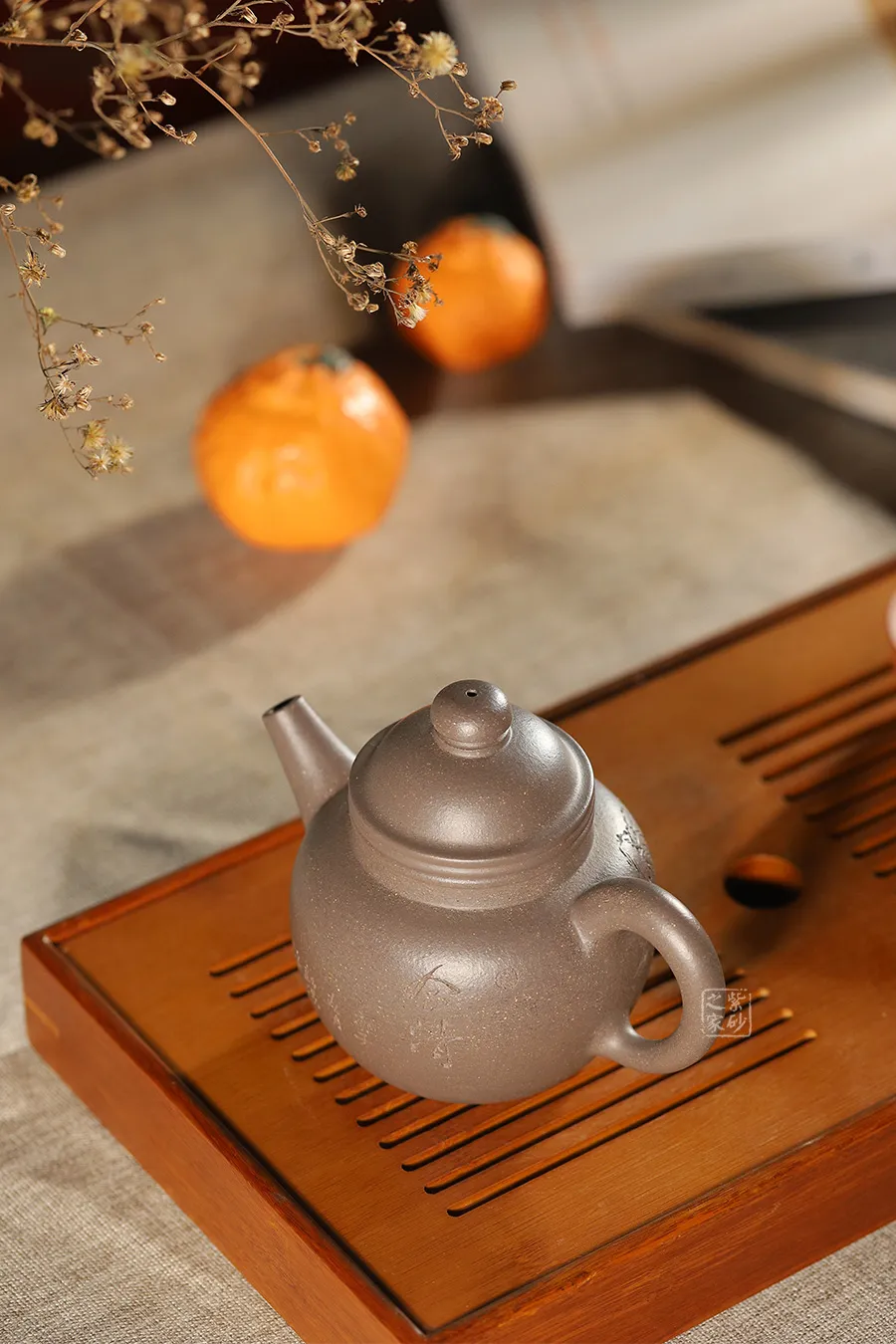 瘦茎尖叶带余馨, 作品外形刚柔并济,蕴含大将之风; 壶身挺秀峻拔,壶肚饱满, 好似能容天下的胸襟; 直嘴长流,昂首挺出,气度不凡,出水畅爽; 把圈浑然,粗细相宜,持握舒适; 壶盖如将军的头盔,珠钮高挺似鹖冠之顶, 铮铮铁骨的形象,增添了一份王者之气。 家藏天青泥料,色泽古朴,低调奢华。 线条简练,数笔生韵,足见其精湛的刻绘功底。 气韵清雅,风格大气又不失优雅, 细节精致,赏藏上品。 篇幅有限,待更新···
