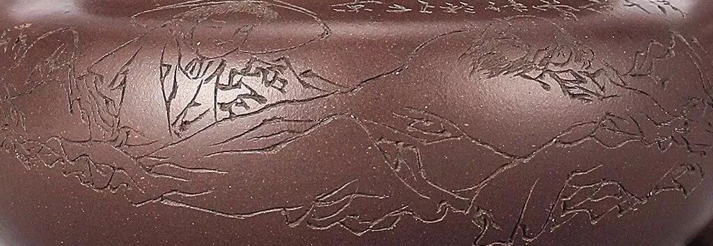 景舟仿古以大亨仿古为样,融入新意,“扁”正是顾景舟仿古壶的新意所在,身扁、腹鼓、颈高,盖板平滑壶盖与口沿字母线吻合严密,合成圆线饱满,扁钮有力,虹钮有势二弯流胥出自然,圆圈把匀势而起,富于灵动,整体骨肉亭匀,收展有度。