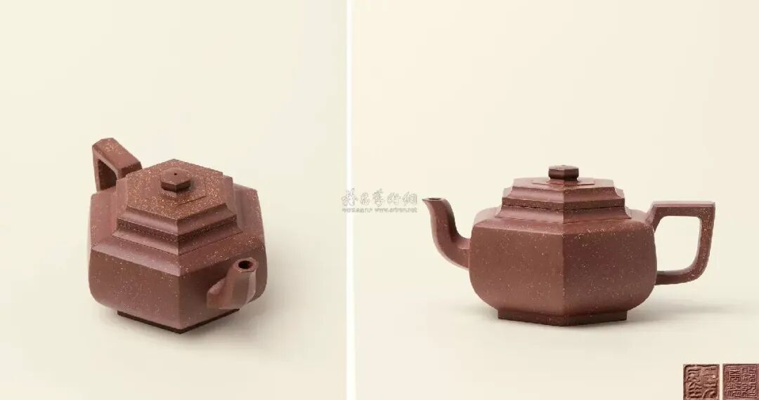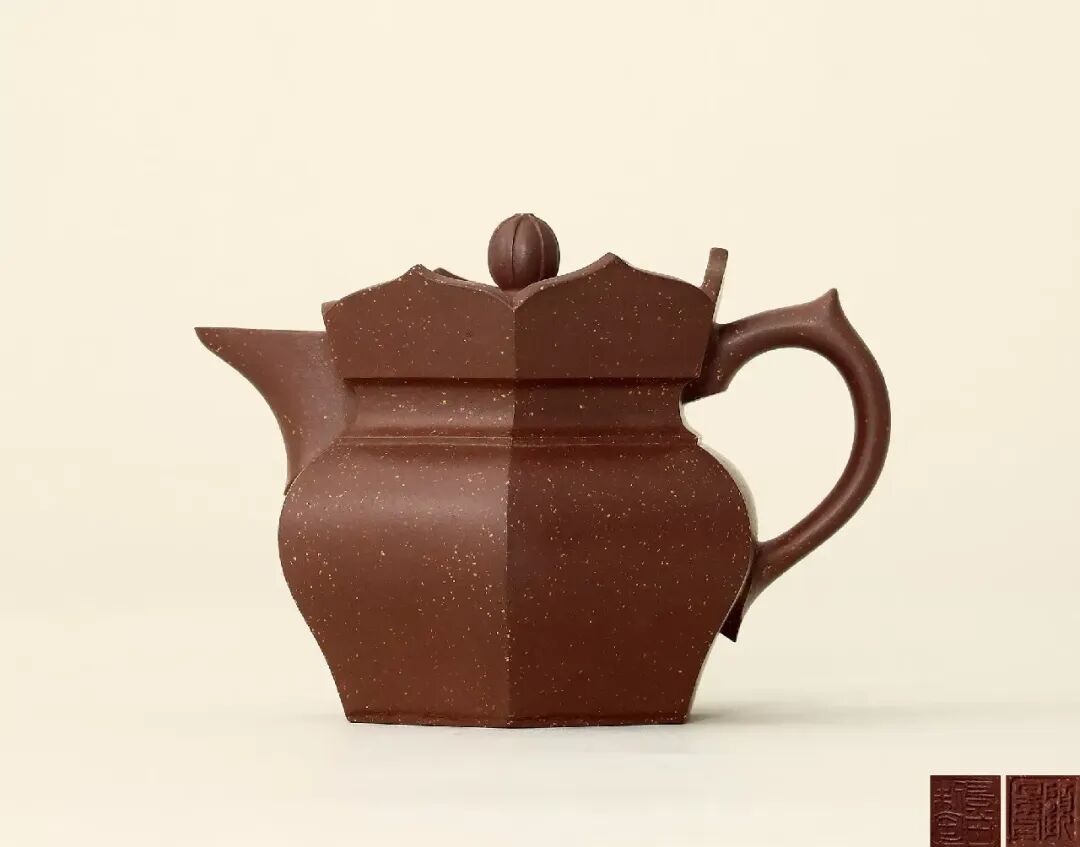 紫砂方器传世较少,而经典的六方传器更少。一方顶三圆,紫砂方器比圆器更难做,是重要原因。尤其是钝角、大圆角的处理,非经验老到者不能为。
