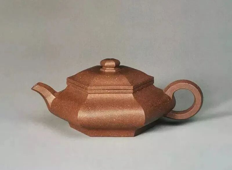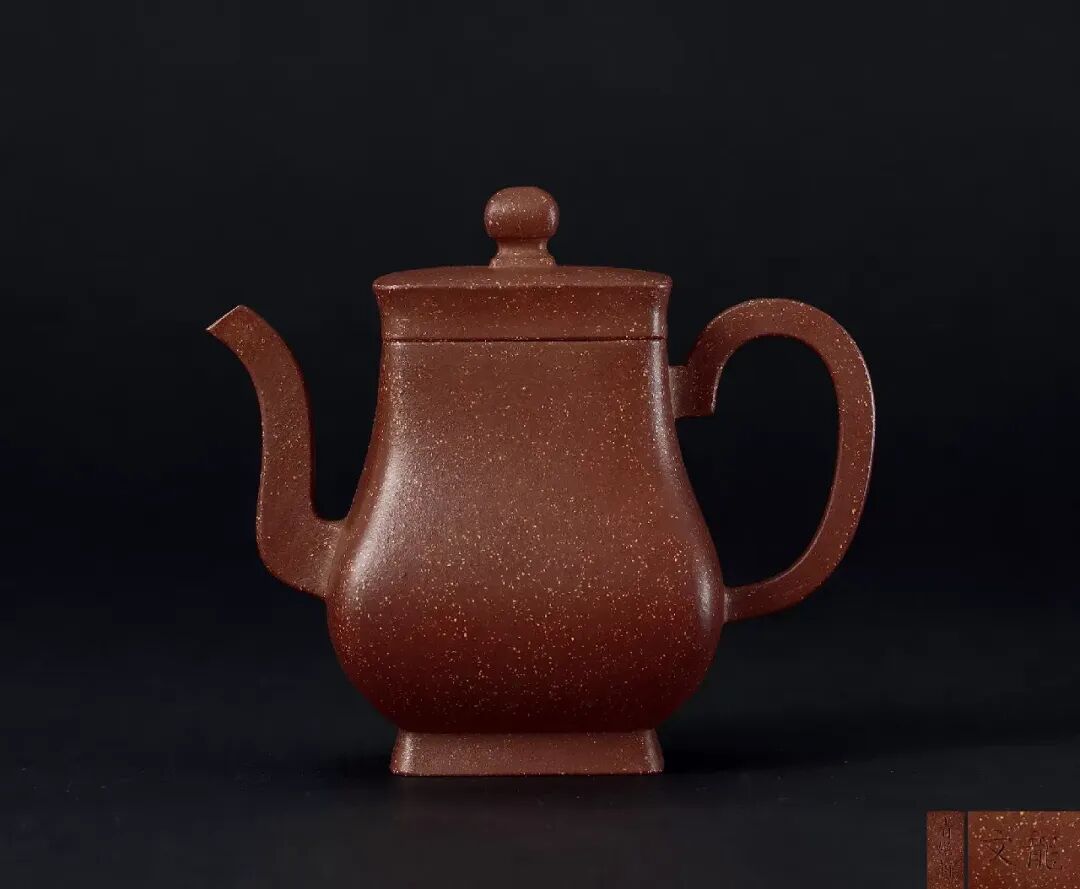 壶盖为紫砂壶式中少见的四方罩盖,这种截盖式结构可使壶盖与壶身连为一体,上下贯气,从壶身线面观察,壶盖上缘外撇斜出,缓坡而下至壶口后向外撇出,下腹鼓出后急收至底,反折为四方圈足。三弯流嘴灵动有神,耳把上缘由壶肩横出,最是点睛,妙不可阶。综观全器,造型明快,线条潇洒流畅,优雅大方,方中寓曲,曲直相济,当非斲轮老手莫辨。
