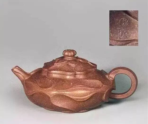 流直錾环,通体以秋葵花为式,千瓣参差,向背分明,瓣在腹者最大,在底者次之,在盖者又次之。的与流鋬亦各施工,流下有二小印:“荆溪”“龙文”,泥色紫而梨皮。