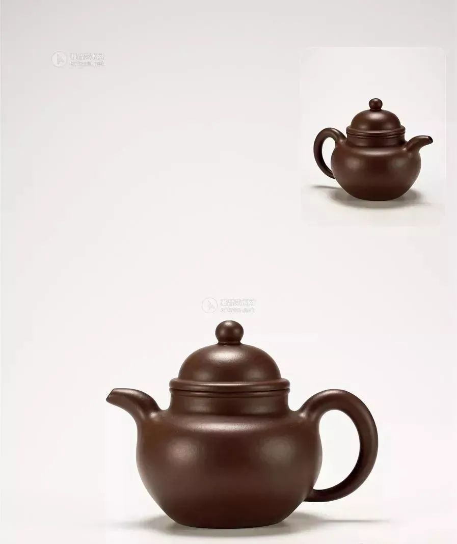 壶盖极度夸张,呈饱满的半圆球;壶钮圆珠适度放扁,在视觉上让壶盖的张力充分展开;