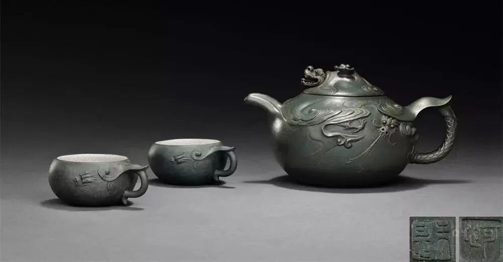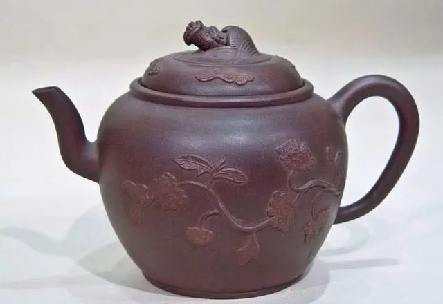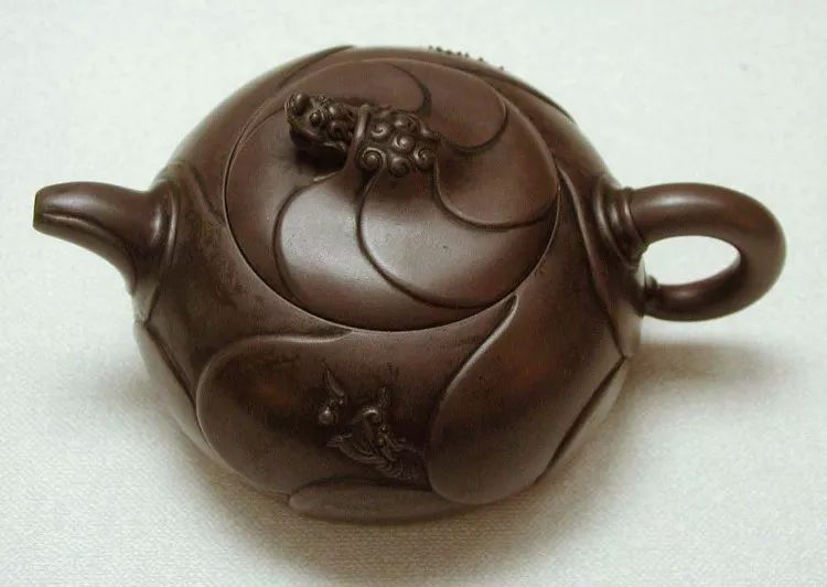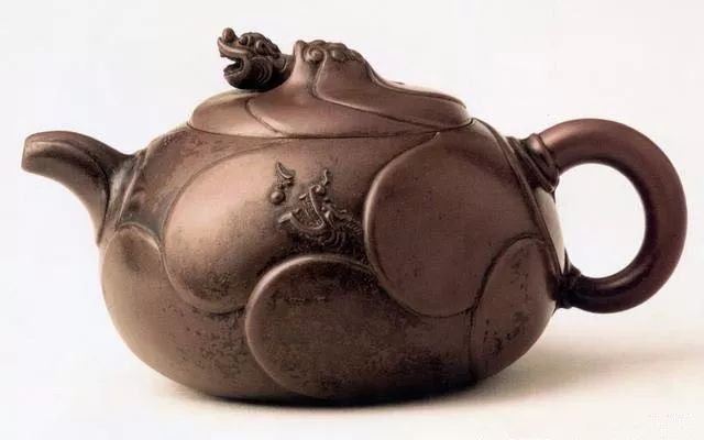 《阳羡茗壶系》载:“陈仲美,······重迭刻,细极鬼工。壶象花果,缀以草虫,或龙戏海涛,伸爪出目。”