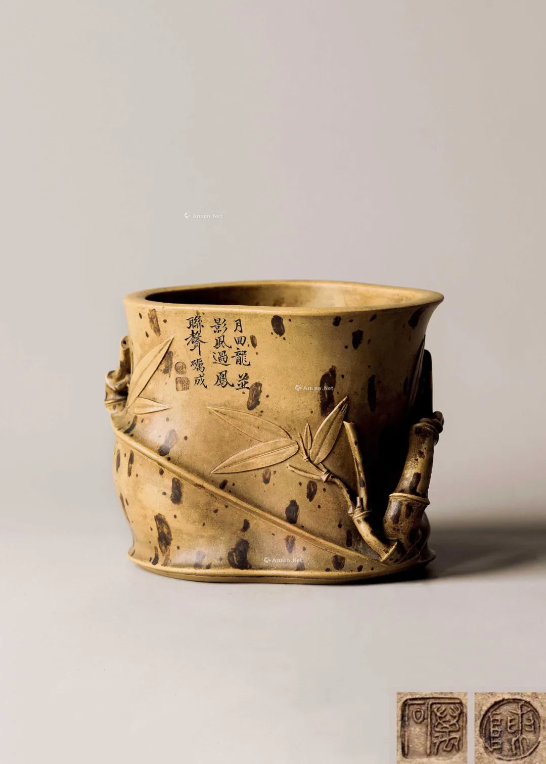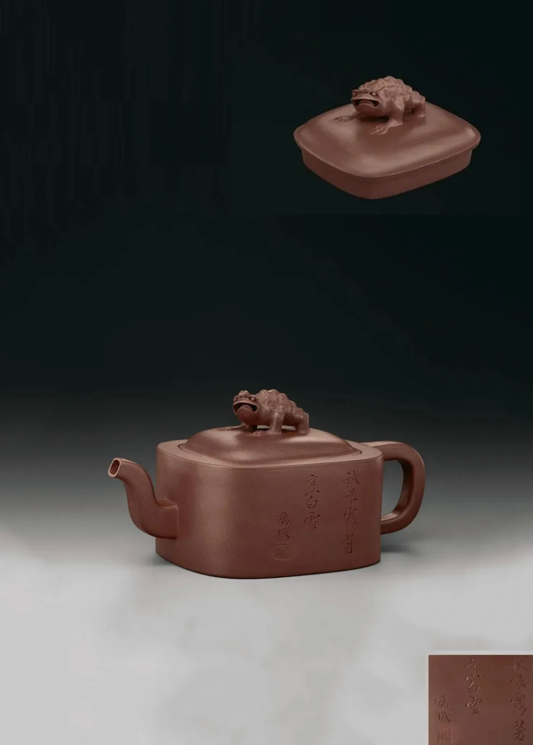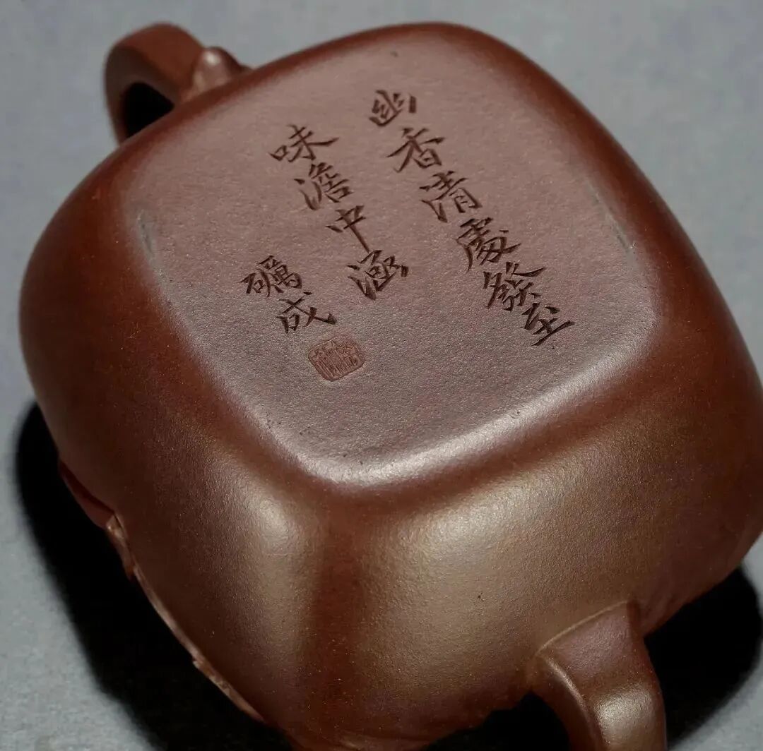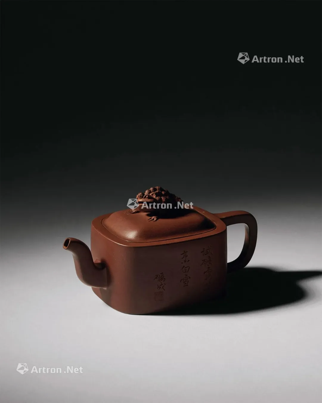 见誉史册、为大众耳熟能祥的紫砂名家,其作品向来是拍卖会上的宠儿,藏家竞相追逐的目标。但是有这么一部分人,虽作者或陶刻者其人并不为大众所熟知,但拍卖价也逾百万。 今天给大家再重点介绍一位——陈砺成,陈砺成为清雍正、乾隆年间的制壶高手,关于他的记载不多,从他的传世作品来看皆精工细作,可见技艺超凡。 此件《斑竹笔筒》则为砺成作品中少见的仿生花器。通体以本山绿泥抟制,造形仿拟两节斑竹节,器身贴塑竹枝、竹节、竹叶,以褐色泥浆泥绘潇湘泪斑,展现了紫砂仿生器的装饰技法。尤其竹叶贴花乃宜兴陈氏一贯风格,砺成此作,颇有陈鸣远之况味。 《斑竹笔筒》仿拟两节斑竹节作为筒身,全器上下四方无一直线,俯而观之,亦非正圆,而是如实呈现椭圆形的竹筒截面。最可观之处,在于以弧线、曲面营造出强烈的律动感,每一转换视角,整体轮廓随之游动,或收腰缩腹,或丰臀纤腰,波折起伏,流转律动,有如水中观鱼摆尾、长带迎风招展。 此作最精彩之处,在于:存世砺成作品有束带装饰者并不少见,可谓其作品特色,但多为水平线圈,此器之束带则仿拟竹节,做成斜圈,巧妙地将中段的竹节线夸张化处理,传递出四种观赏面向的不同趣味,“横看成岭侧成峰,远近高低各不同”:从正面欣赏时,中线略凹,左侧微鼓,竹节线从中腰大幅右倾至器底,隐于枝繁叶茂处,布局看似左轻右重,实则左上方的三行铭文有力地抓住观赏者的视线,达到妙不可喻的平衡。 若从左侧观赏,器身倏然变瘦,竹节线平正地置于中腰,下节微鼓,器足飘起有如裙摆,上节以贴塑手法描写两枝嫩竹左右伸展,生机蓬勃,呼应着竹筒口沿向外撇出的动态。再将竹筒顺势转到背面,又呈现另番风情,反向的竹节斜圈望若扭腰摆臀的舞者,左侧竹叶疏朗招展,右上节枝叶繁密。最后转到竹筒右侧面,器形收敛,缩腰敞口,原本的竹节斜圈急收至底处,退为配角,换由一大一小的新竹窜生,姿态灵动,有若游龙,令人赞叹不已。 最后将笔筒转回正面,细品双刀精刻的铭文:“月回龙并影 风过凤联声”更加拜服陈砺成的匠心独运之处!此件〈斑竹笔筒〉从造形施设、工艺,到铭文典故,砺成无不以其巧思围绕竹主题创作,若能配诸高士,置诸案头,则一人一竹,皆是高风亮节,如此则亦堪并影、联声之谓矣。 款识:砺成(底款);砺成(刻款) 镌刻:幽香清处发,至味澹中涵。砺成 紫砂材质精炼,色泽温润,此壶呈圆角长方型,坡状壶盖设三足蟾蜍钮,不论身筒、壶流、壶把皆方中有圆,圆中寓方,整体比例得当,气韵珠圆玉润,如此高难度制作,却能举重若轻,实属不易,不愧一代良工佳作。壶身铭刻:“试碾露牙烹白雪。砺成。”并落二字阳文篆书印款“砺成”。 蟾蜍古称“月精”,民间视为神物,可辟五兵,镇凶邪,助长生,主富贵。三足蟾又兆财富,得之使人发财致富,乃视为祥瑞之物。 清乾隆 陈砺成制金蟾方壶 壶身乃六片镶接而成,造型拟六瓣莲花合拢之态,圆中寓方,线条过渡自然流畅,比例得当,有婀娜之美,对称之姿,颇见功力,于素净之中凭添一分华贵之气。壶盖亦为六边,流、把亦化圆为方,各部衔接自然光滑;钮、盖、把、流、身大小比例协调,结构严谨,多一分则累赘,少一分则缺憾。“六”为易数,变化万千,包容万象,寓意吉祥。壶底钤“砺成造”文篆书印款。整器浑然天成,不事修饰,如谦谦君子,质而不野,温润而有刚毅正气,俯仰之间,坦荡从容,品读有味,实属难得佳作。 盘身敞口,圆唇,口作圆形,口下外壁作棱纹为饰,盘身造型自口部向下斜收内敛,至腹底向内弯折,过度圆转平和,下接圈足,足壁略高,足底上端另作棱纹与沿口纹饰相互呼应,四盘身内壁光滑平整,外壁堆泥雕绘山水图案,画面前景雕琢数珠大树,树干因堆泥之故而呈现浮雕立体之感,前景树干相互排列而置,互无遮挡,主干姿态各异,多作曲折蜿蜒而向上生长之姿,树身外皮、树瘤清晰可见,雕琢精制细微,树上枝叶繁茂,雕刻技法各样,或为单线阴刻,或作双线勾描,相互交错使用,富于变化。后景绘湖岸远山,多为江南景致,山丘层层叠叠,起伏和缓,其间亦以阴刻之法,表现山石间杂草、苔点,颇具意境。盘底作阳文篆书“陈砺成制”方印款识,呈现清代文人雅致气息。 壶作高四方,亦称春炉式,壶身自下而上渐趋丰满,四棱作圆化处理。 此壶溜肩挺腹,沿势下收腰微撇足,压盖短颈,盖面隆起中竖钮柱,弯流上翘,鋬环垂滴,两者对称协调。此壶成型难度极大,如此精工细作,张弛有度,尽显大将之风。身筒一面铭刻“气作金华露,香嘘玉椀花。”侧旁署名“砺成”,并钤有“厉石”方章。