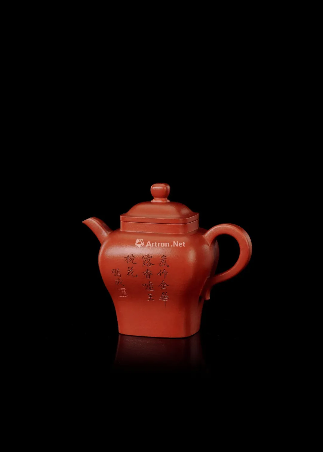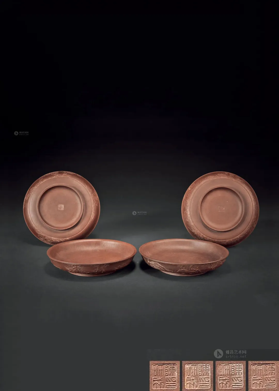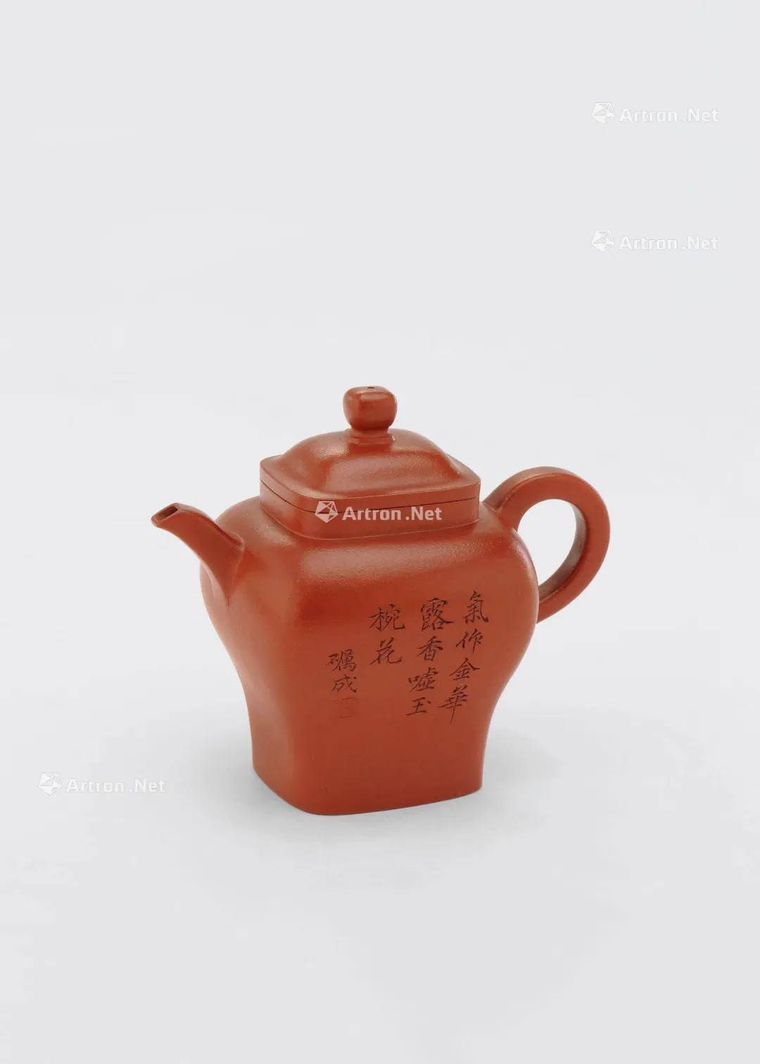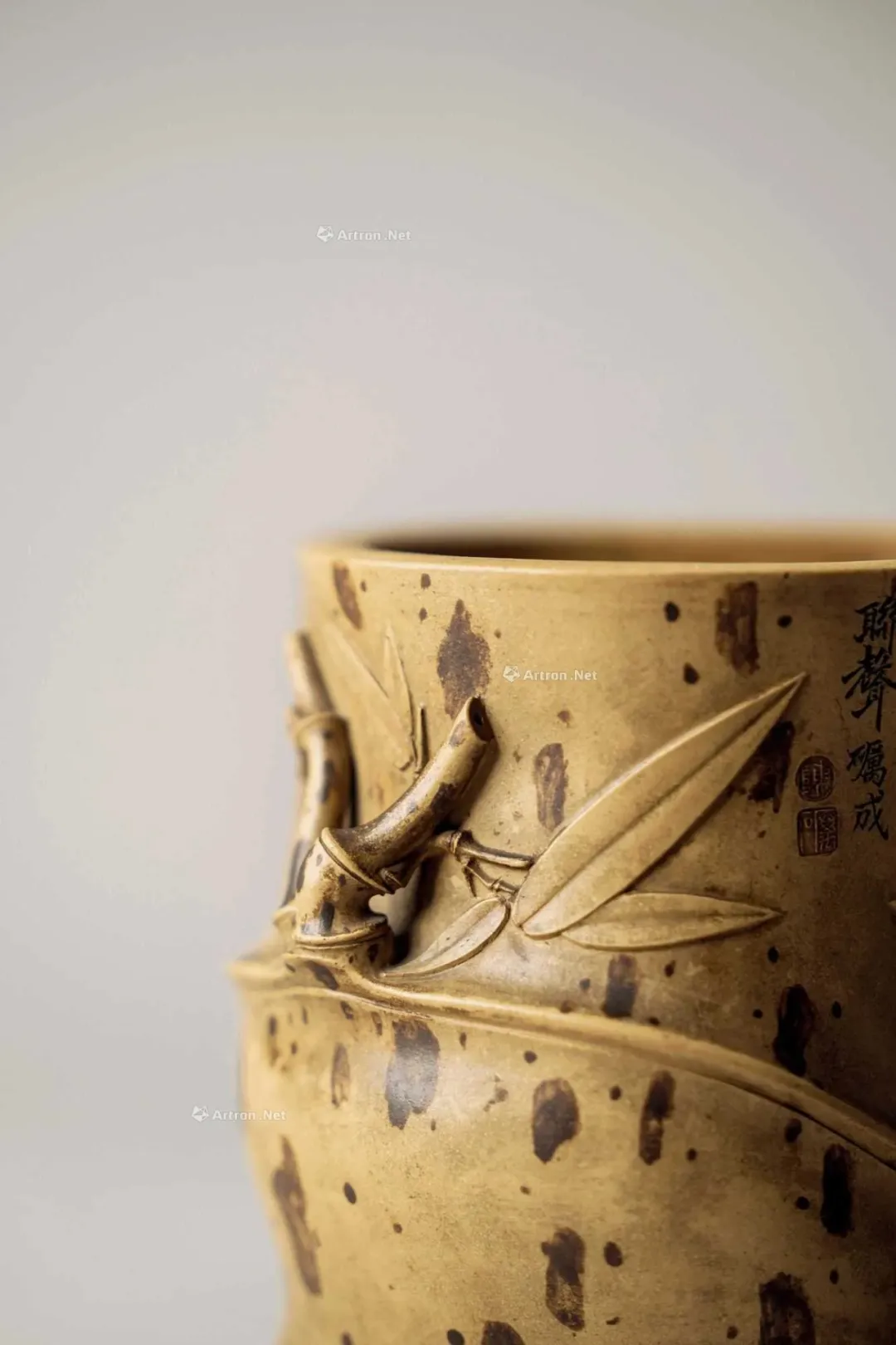 见誉史册、为大众耳熟能祥的紫砂名家,其作品向来是拍卖会上的宠儿,藏家竞相追逐的目标。但是有这么一部分人,虽作者或陶刻者其人并不为大众所熟知,但拍卖价也逾百万。 今天给大家再重点介绍一位——陈砺成,陈砺成为清雍正、乾隆年间的制壶高手,关于他的记载不多,从他的传世作品来看皆精工细作,可见技艺超凡。 此件《斑竹笔筒》则为砺成作品中少见的仿生花器。通体以本山绿泥抟制,造形仿拟两节斑竹节,器身贴塑竹枝、竹节、竹叶,以褐色泥浆泥绘潇湘泪斑,展现了紫砂仿生器的装饰技法。尤其竹叶贴花乃宜兴陈氏一贯风格,砺成此作,颇有陈鸣远之况味。 《斑竹笔筒》仿拟两节斑竹节作为筒身,全器上下四方无一直线,俯而观之,亦非正圆,而是如实呈现椭圆形的竹筒截面。最可观之处,在于以弧线、曲面营造出强烈的律动感,每一转换视角,整体轮廓随之游动,或收腰缩腹,或丰臀纤腰,波折起伏,流转律动,有如水中观鱼摆尾、长带迎风招展。 此作最精彩之处,在于:存世砺成作品有束带装饰者并不少见,可谓其作品特色,但多为水平线圈,此器之束带则仿拟竹节,做成斜圈,巧妙地将中段的竹节线夸张化处理,传递出四种观赏面向的不同趣味,“横看成岭侧成峰,远近高低各不同”:从正面欣赏时,中线略凹,左侧微鼓,竹节线从中腰大幅右倾至器底,隐于枝繁叶茂处,布局看似左轻右重,实则左上方的三行铭文有力地抓住观赏者的视线,达到妙不可喻的平衡。 若从左侧观赏,器身倏然变瘦,竹节线平正地置于中腰,下节微鼓,器足飘起有如裙摆,上节以贴塑手法描写两枝嫩竹左右伸展,生机蓬勃,呼应着竹筒口沿向外撇出的动态。再将竹筒顺势转到背面,又呈现另番风情,反向的竹节斜圈望若扭腰摆臀的舞者,左侧竹叶疏朗招展,右上节枝叶繁密。最后转到竹筒右侧面,器形收敛,缩腰敞口,原本的竹节斜圈急收至底处,退为配角,换由一大一小的新竹窜生,姿态灵动,有若游龙,令人赞叹不已。 最后将笔筒转回正面,细品双刀精刻的铭文:“月回龙并影 风过凤联声”更加拜服陈砺成的匠心独运之处!此件〈斑竹笔筒〉从造形施设、工艺,到铭文典故,砺成无不以其巧思围绕竹主题创作,若能配诸高士,置诸案头,则一人一竹,皆是高风亮节,如此则亦堪并影、联声之谓矣。 款识:砺成(底款);砺成(刻款) 镌刻:幽香清处发,至味澹中涵。砺成 紫砂材质精炼,色泽温润,此壶呈圆角长方型,坡状壶盖设三足蟾蜍钮,不论身筒、壶流、壶把皆方中有圆,圆中寓方,整体比例得当,气韵珠圆玉润,如此高难度制作,却能举重若轻,实属不易,不愧一代良工佳作。壶身铭刻:“试碾露牙烹白雪。砺成。”并落二字阳文篆书印款“砺成”。 蟾蜍古称“月精”,民间视为神物,可辟五兵,镇凶邪,助长生,主富贵。三足蟾又兆财富,得之使人发财致富,乃视为祥瑞之物。 清乾隆 陈砺成制金蟾方壶 壶身乃六片镶接而成,造型拟六瓣莲花合拢之态,圆中寓方,线条过渡自然流畅,比例得当,有婀娜之美,对称之姿,颇见功力,于素净之中凭添一分华贵之气。壶盖亦为六边,流、把亦化圆为方,各部衔接自然光滑;钮、盖、把、流、身大小比例协调,结构严谨,多一分则累赘,少一分则缺憾。“六”为易数,变化万千,包容万象,寓意吉祥。壶底钤“砺成造”文篆书印款。整器浑然天成,不事修饰,如谦谦君子,质而不野,温润而有刚毅正气,俯仰之间,坦荡从容,品读有味,实属难得佳作。 盘身敞口,圆唇,口作圆形,口下外壁作棱纹为饰,盘身造型自口部向下斜收内敛,至腹底向内弯折,过度圆转平和,下接圈足,足壁略高,足底上端另作棱纹与沿口纹饰相互呼应,四盘身内壁光滑平整,外壁堆泥雕绘山水图案,画面前景雕琢数珠大树,树干因堆泥之故而呈现浮雕立体之感,前景树干相互排列而置,互无遮挡,主干姿态各异,多作曲折蜿蜒而向上生长之姿,树身外皮、树瘤清晰可见,雕琢精制细微,树上枝叶繁茂,雕刻技法各样,或为单线阴刻,或作双线勾描,相互交错使用,富于变化。后景绘湖岸远山,多为江南景致,山丘层层叠叠,起伏和缓,其间亦以阴刻之法,表现山石间杂草、苔点,颇具意境。盘底作阳文篆书“陈砺成制”方印款识,呈现清代文人雅致气息。 壶作高四方,亦称春炉式,壶身自下而上渐趋丰满,四棱作圆化处理。 此壶溜肩挺腹,沿势下收腰微撇足,压盖短颈,盖面隆起中竖钮柱,弯流上翘,鋬环垂滴,两者对称协调。此壶成型难度极大,如此精工细作,张弛有度,尽显大将之风。身筒一面铭刻“气作金华露,香嘘玉椀花。”侧旁署名“砺成”,并钤有“厉石”方章。