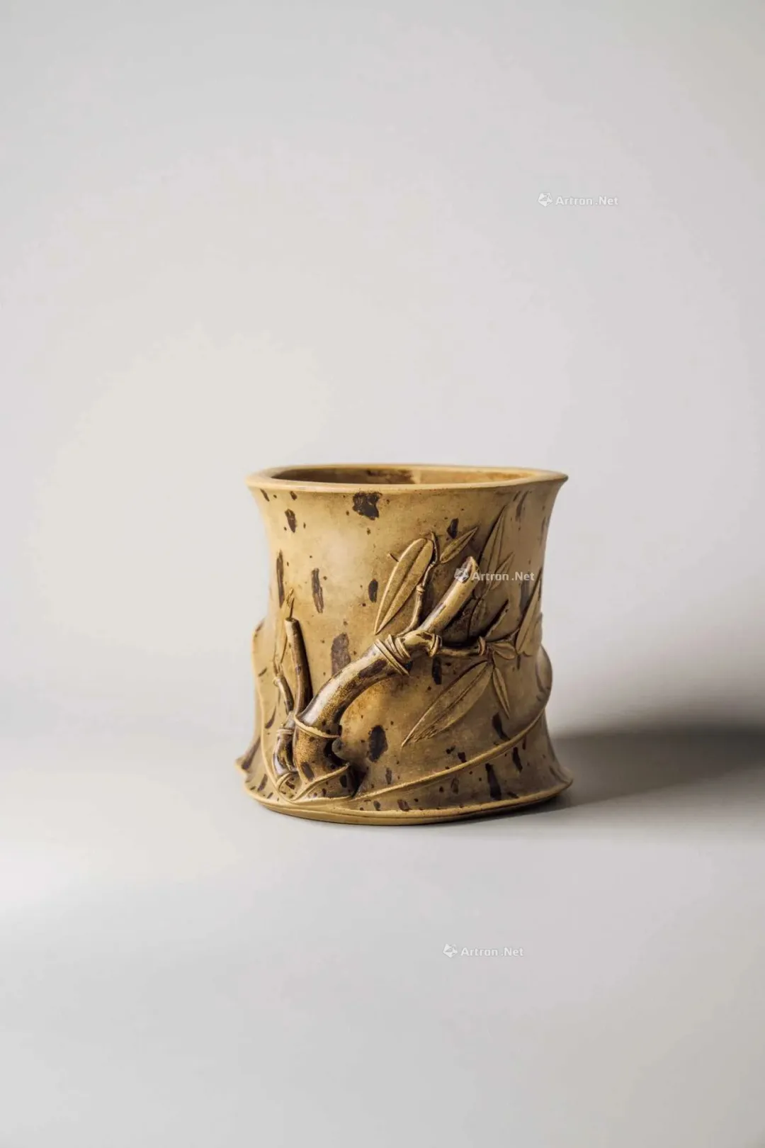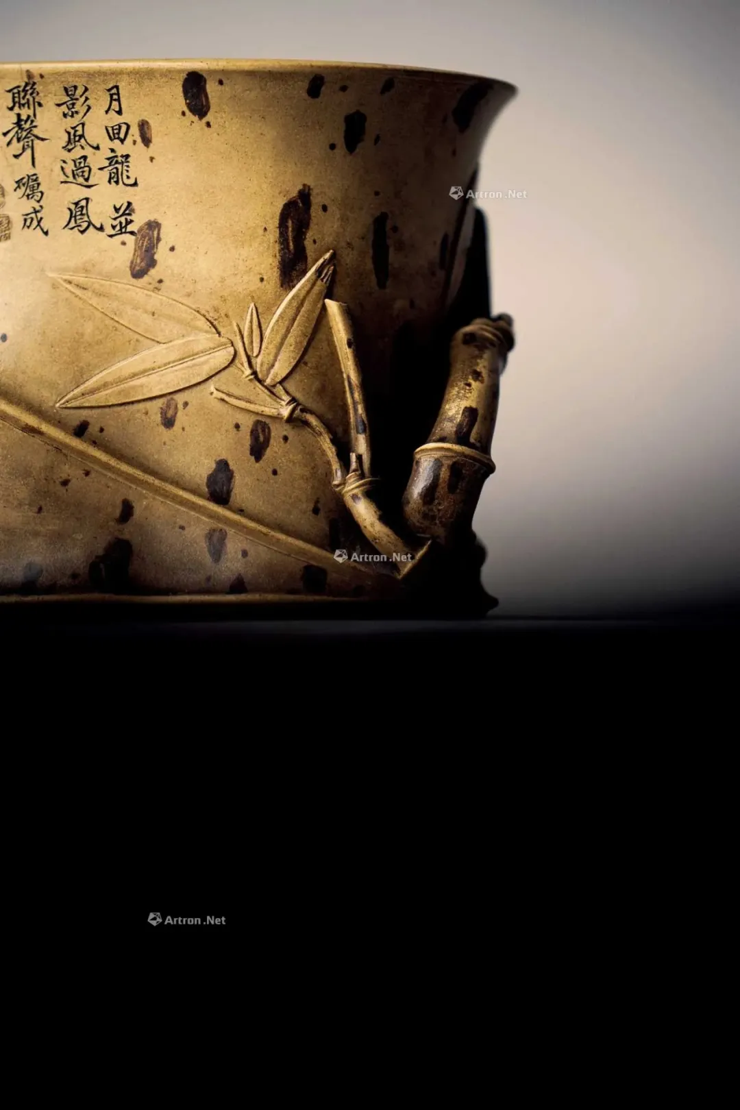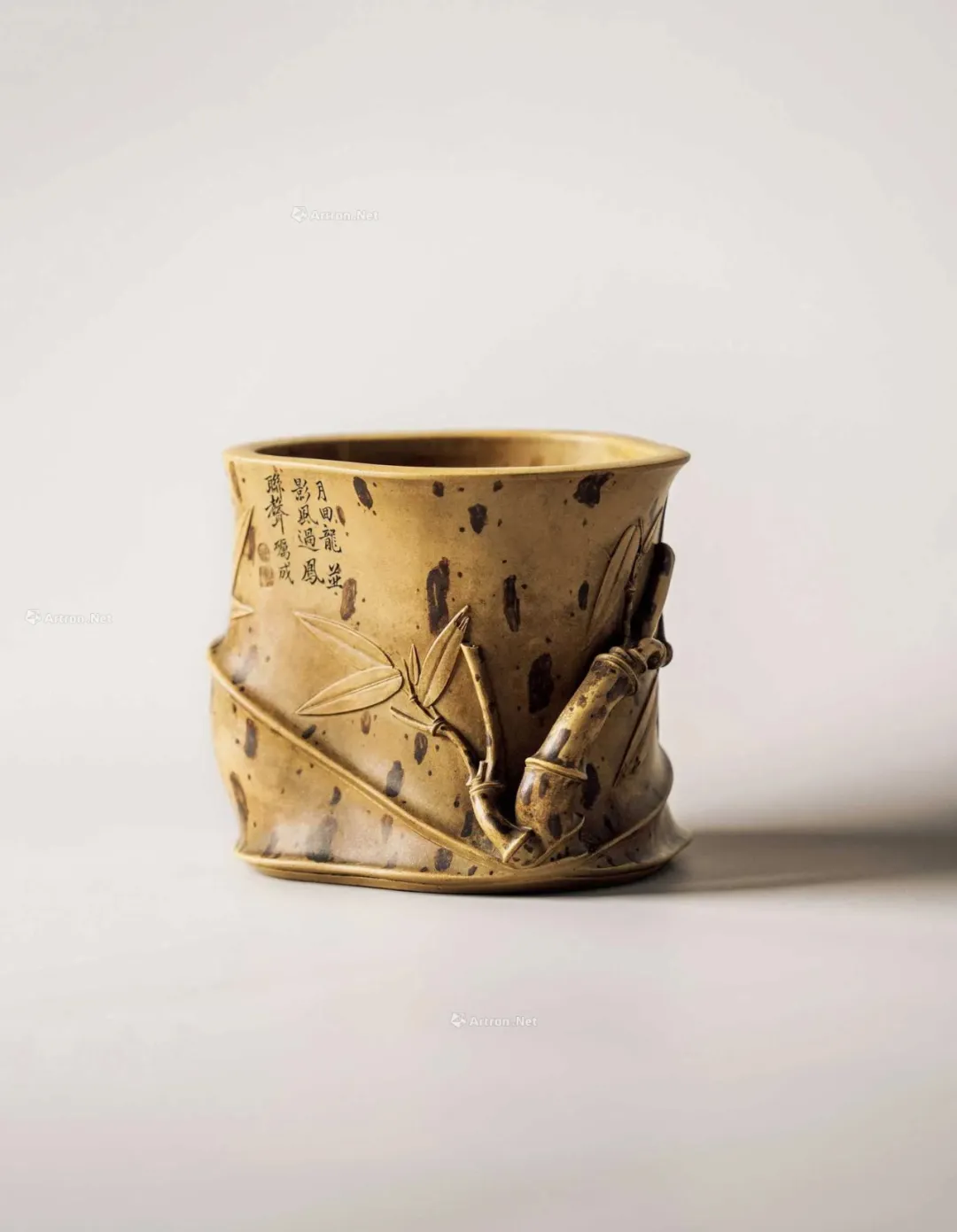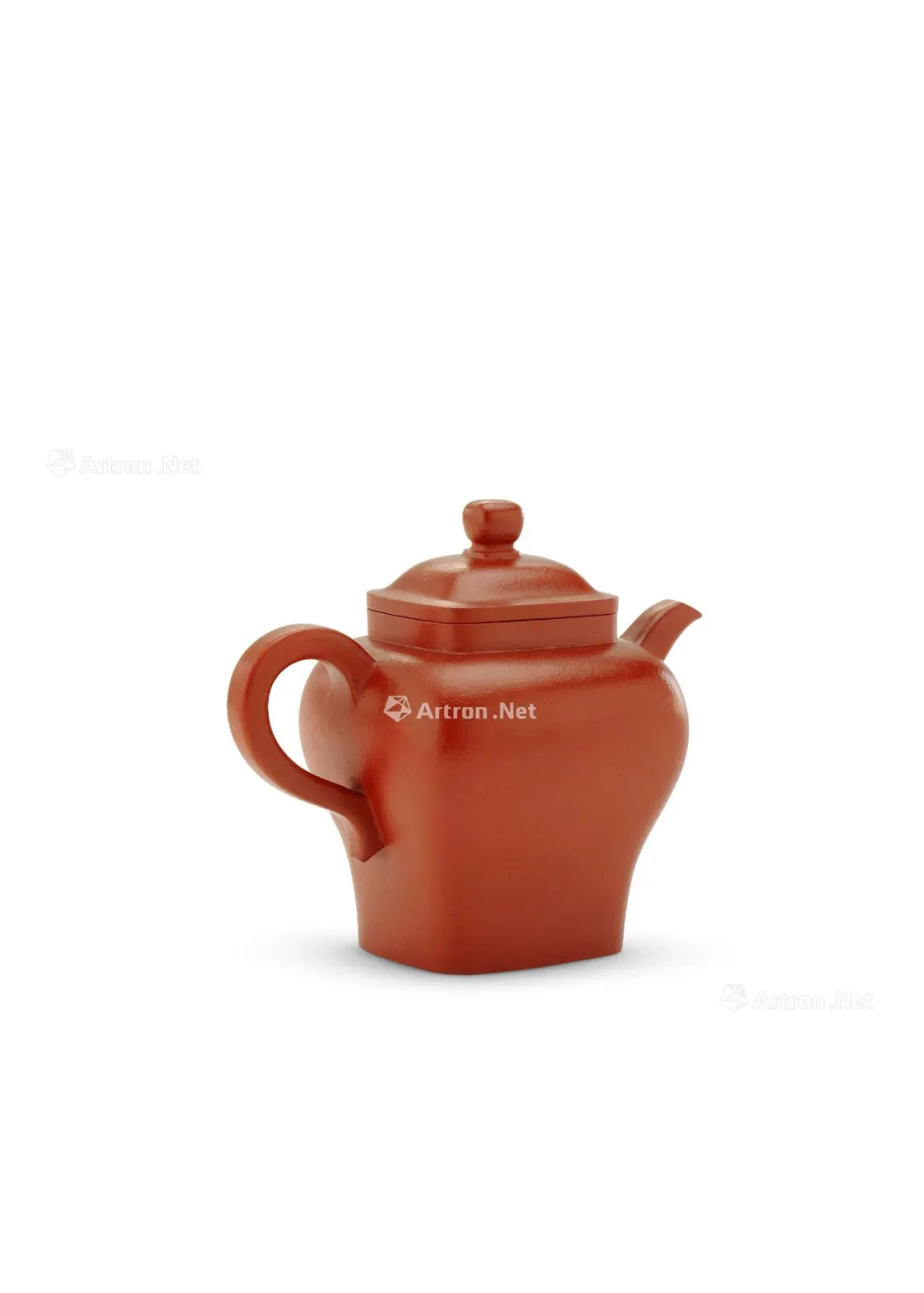 见誉史册、为大众耳熟能祥的紫砂名家,其作品向来是拍卖会上的宠儿,藏家竞相追逐的目标。但是有这么一部分人,虽作者或陶刻者其人并不为大众所熟知,但拍卖价也逾百万。 今天给大家再重点介绍一位——陈砺成,陈砺成为清雍正、乾隆年间的制壶高手,关于他的记载不多,从他的传世作品来看皆精工细作,可见技艺超凡。 此件《斑竹笔筒》则为砺成作品中少见的仿生花器。通体以本山绿泥抟制,造形仿拟两节斑竹节,器身贴塑竹枝、竹节、竹叶,以褐色泥浆泥绘潇湘泪斑,展现了紫砂仿生器的装饰技法。尤其竹叶贴花乃宜兴陈氏一贯风格,砺成此作,颇有陈鸣远之况味。 《斑竹笔筒》仿拟两节斑竹节作为筒身,全器上下四方无一直线,俯而观之,亦非正圆,而是如实呈现椭圆形的竹筒截面。最可观之处,在于以弧线、曲面营造出强烈的律动感,每一转换视角,整体轮廓随之游动,或收腰缩腹,或丰臀纤腰,波折起伏,流转律动,有如水中观鱼摆尾、长带迎风招展。 此作最精彩之处,在于:存世砺成作品有束带装饰者并不少见,可谓其作品特色,但多为水平线圈,此器之束带则仿拟竹节,做成斜圈,巧妙地将中段的竹节线夸张化处理,传递出四种观赏面向的不同趣味,“横看成岭侧成峰,远近高低各不同”:从正面欣赏时,中线略凹,左侧微鼓,竹节线从中腰大幅右倾至器底,隐于枝繁叶茂处,布局看似左轻右重,实则左上方的三行铭文有力地抓住观赏者的视线,达到妙不可喻的平衡。 若从左侧观赏,器身倏然变瘦,竹节线平正地置于中腰,下节微鼓,器足飘起有如裙摆,上节以贴塑手法描写两枝嫩竹左右伸展,生机蓬勃,呼应着竹筒口沿向外撇出的动态。再将竹筒顺势转到背面,又呈现另番风情,反向的竹节斜圈望若扭腰摆臀的舞者,左侧竹叶疏朗招展,右上节枝叶繁密。最后转到竹筒右侧面,器形收敛,缩腰敞口,原本的竹节斜圈急收至底处,退为配角,换由一大一小的新竹窜生,姿态灵动,有若游龙,令人赞叹不已。 最后将笔筒转回正面,细品双刀精刻的铭文:“月回龙并影 风过凤联声”更加拜服陈砺成的匠心独运之处!此件〈斑竹笔筒〉从造形施设、工艺,到铭文典故,砺成无不以其巧思围绕竹主题创作,若能配诸高士,置诸案头,则一人一竹,皆是高风亮节,如此则亦堪并影、联声之谓矣。 款识:砺成(底款);砺成(刻款) 镌刻:幽香清处发,至味澹中涵。砺成 紫砂材质精炼,色泽温润,此壶呈圆角长方型,坡状壶盖设三足蟾蜍钮,不论身筒、壶流、壶把皆方中有圆,圆中寓方,整体比例得当,气韵珠圆玉润,如此高难度制作,却能举重若轻,实属不易,不愧一代良工佳作。壶身铭刻:“试碾露牙烹白雪。砺成。”并落二字阳文篆书印款“砺成”。 蟾蜍古称“月精”,民间视为神物,可辟五兵,镇凶邪,助长生,主富贵。三足蟾又兆财富,得之使人发财致富,乃视为祥瑞之物。 清乾隆 陈砺成制金蟾方壶 壶身乃六片镶接而成,造型拟六瓣莲花合拢之态,圆中寓方,线条过渡自然流畅,比例得当,有婀娜之美,对称之姿,颇见功力,于素净之中凭添一分华贵之气。壶盖亦为六边,流、把亦化圆为方,各部衔接自然光滑;钮、盖、把、流、身大小比例协调,结构严谨,多一分则累赘,少一分则缺憾。“六”为易数,变化万千,包容万象,寓意吉祥。壶底钤“砺成造”文篆书印款。整器浑然天成,不事修饰,如谦谦君子,质而不野,温润而有刚毅正气,俯仰之间,坦荡从容,品读有味,实属难得佳作。 盘身敞口,圆唇,口作圆形,口下外壁作棱纹为饰,盘身造型自口部向下斜收内敛,至腹底向内弯折,过度圆转平和,下接圈足,足壁略高,足底上端另作棱纹与沿口纹饰相互呼应,四盘身内壁光滑平整,外壁堆泥雕绘山水图案,画面前景雕琢数珠大树,树干因堆泥之故而呈现浮雕立体之感,前景树干相互排列而置,互无遮挡,主干姿态各异,多作曲折蜿蜒而向上生长之姿,树身外皮、树瘤清晰可见,雕琢精制细微,树上枝叶繁茂,雕刻技法各样,或为单线阴刻,或作双线勾描,相互交错使用,富于变化。后景绘湖岸远山,多为江南景致,山丘层层叠叠,起伏和缓,其间亦以阴刻之法,表现山石间杂草、苔点,颇具意境。盘底作阳文篆书“陈砺成制”方印款识,呈现清代文人雅致气息。 壶作高四方,亦称春炉式,壶身自下而上渐趋丰满,四棱作圆化处理。 此壶溜肩挺腹,沿势下收腰微撇足,压盖短颈,盖面隆起中竖钮柱,弯流上翘,鋬环垂滴,两者对称协调。此壶成型难度极大,如此精工细作,张弛有度,尽显大将之风。身筒一面铭刻“气作金华露,香嘘玉椀花。”侧旁署名“砺成”,并钤有“厉石”方章。