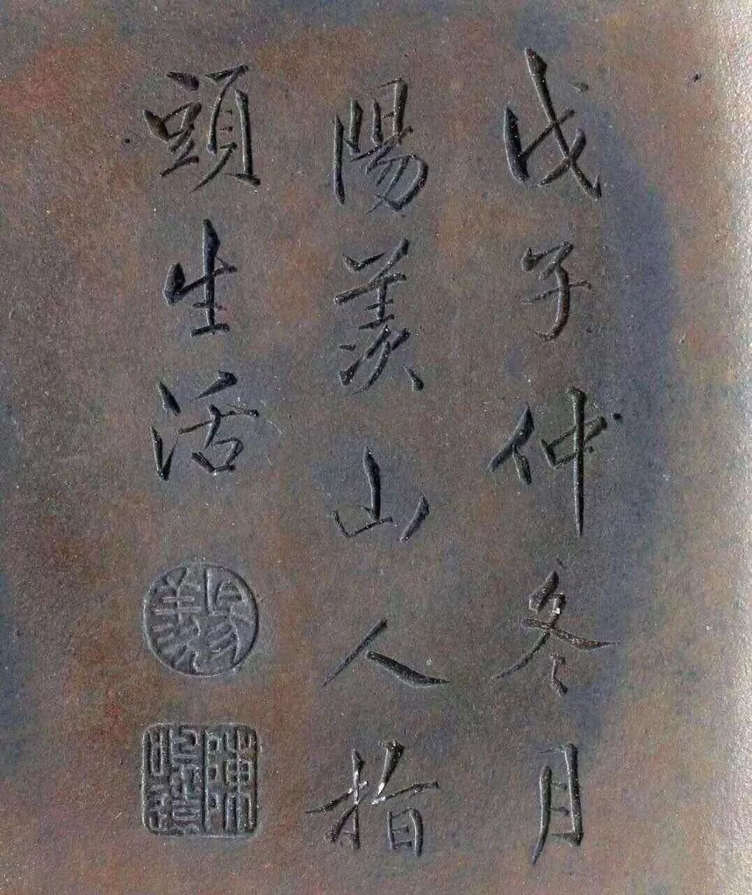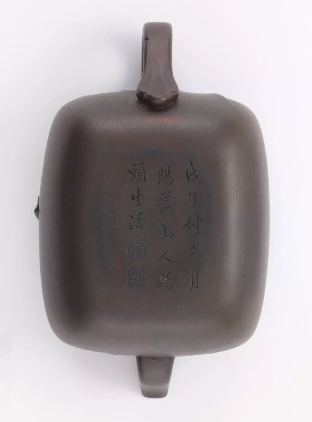 腹刻铭:“柏叶随铭至,椒花逐颂来。庾子山句,廉让书,仿古,壬午重九前二日”,铭文表明此壶作于清康熙41年(1702年)农历九月初七,是陈鸣远仿古酒器而制作的。