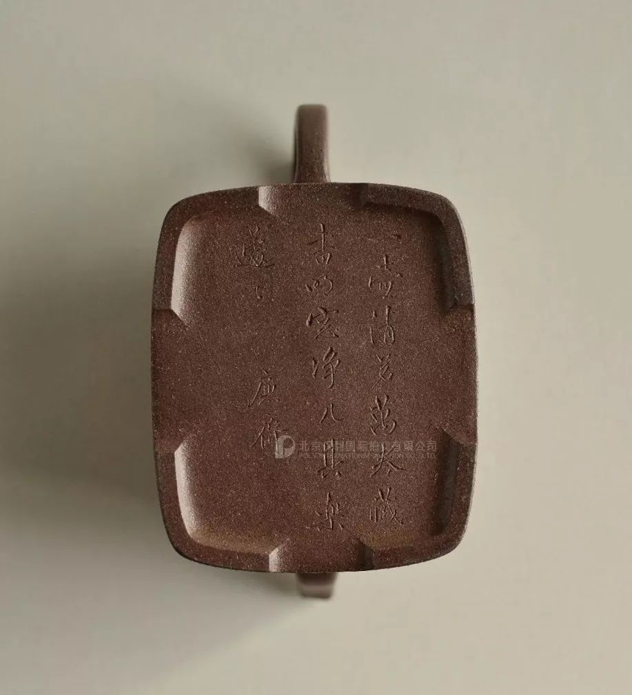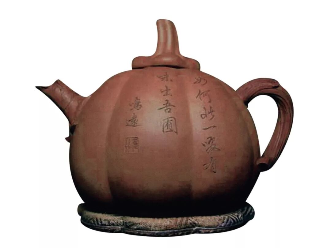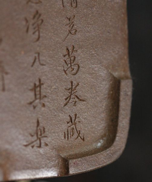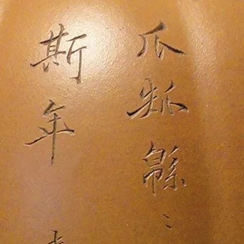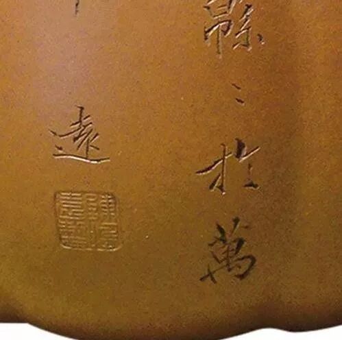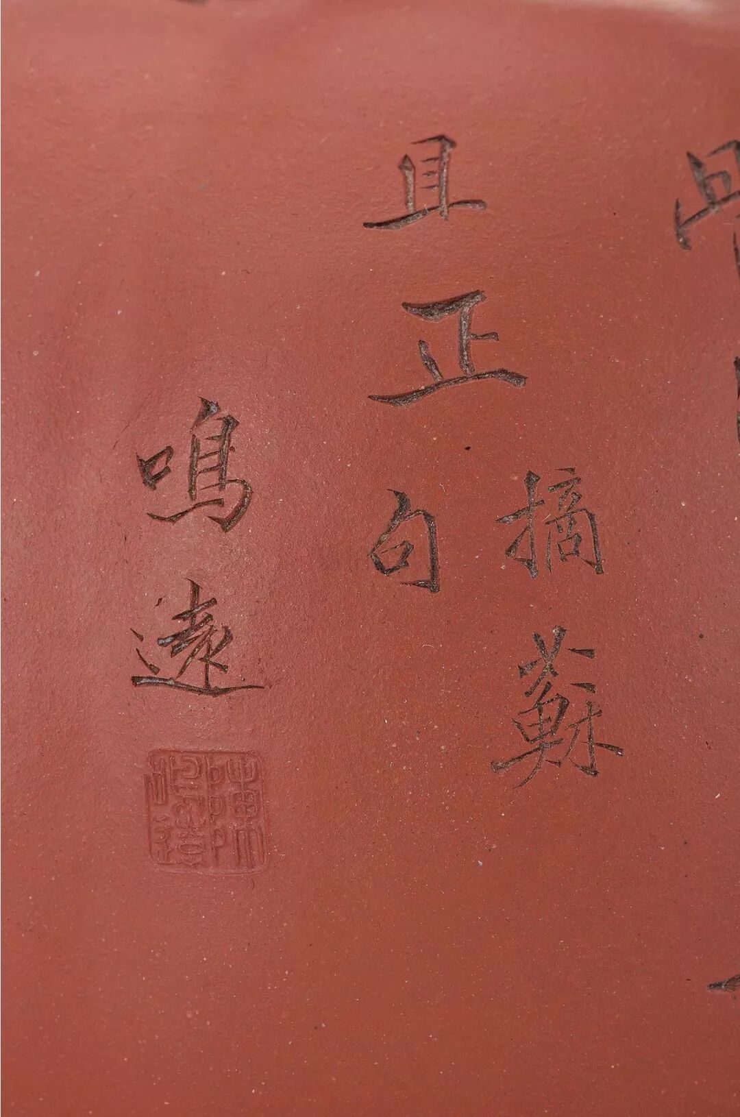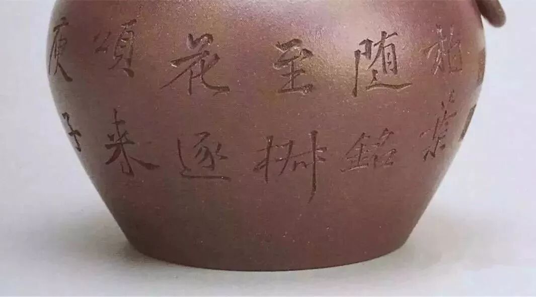 紫砂壶与诗文的结合,使光素无华的壶体增添了隽永的情趣,更具有浓厚的书卷气。紫砂上最美的诗铭镌刻,当属陈鸣远大师铭文镌刻。