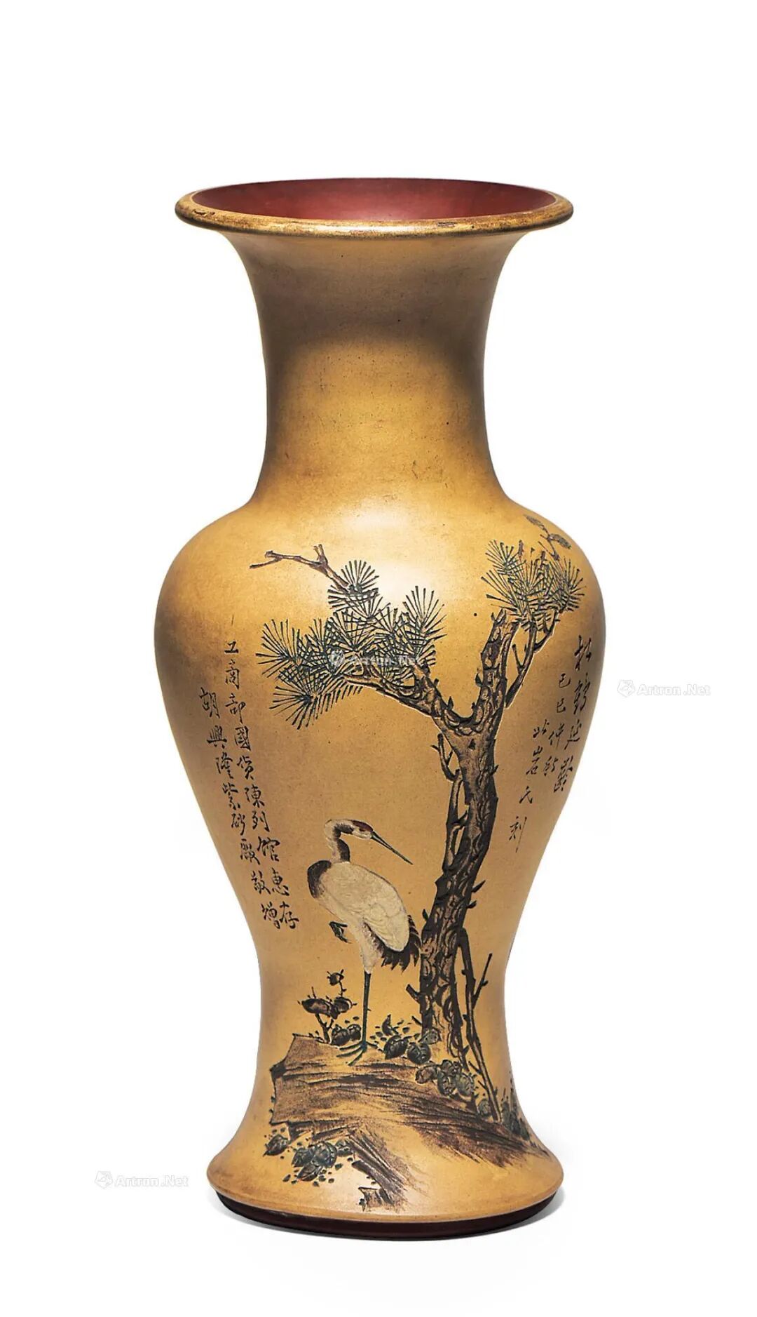 民国 北岩刻紫泥粉段泥松鹤延年赏瓶
