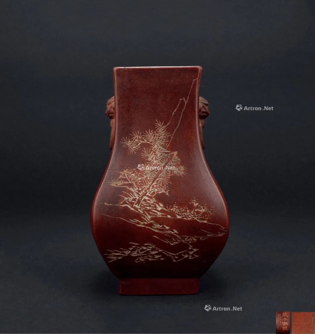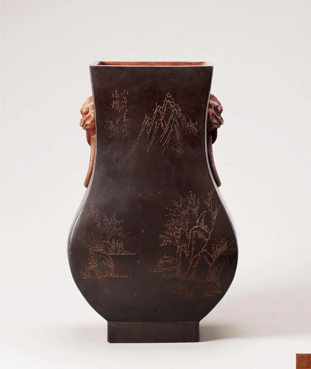 民国 陈光明款北岩刻山水诗文紫砂兽耳方瓶