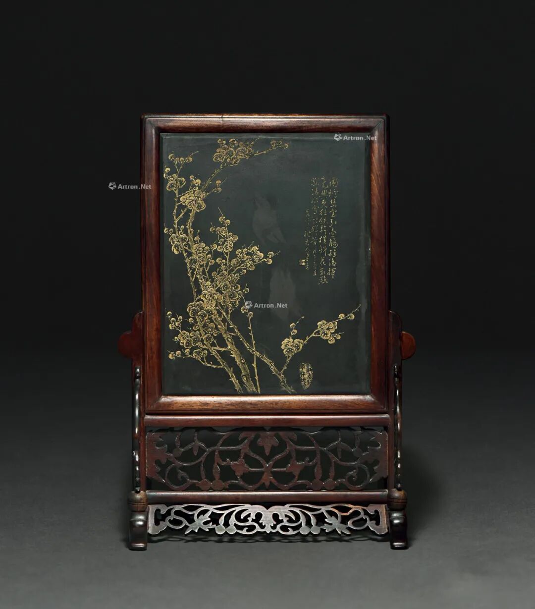 民国 北岩刻粉黑浆插屏(配原装老花梨座)