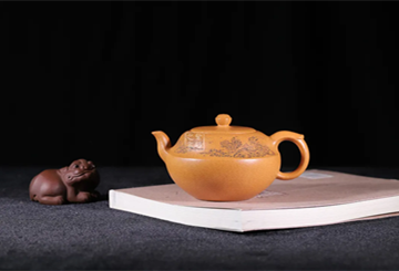 "竹简"是我国秦国时期的书,"书藉是人类进步的阶梯".借"竹简"为创作题材,把一册"竹简",通过艺术,构成一把壶,它寓意壶中砌泡香茗,犹如取之不尽,用之不竭的知识,壶身正背均为五片竹简组成,中间结上一根丝绫编绳,装上咀把的盖,配上杯碟,成为一套竹简茶具. 壶身筒上,刻<孙膑兵法>中"擒庞涓"片段,借鉴历史故事,告戒我辈,在携手共进人生的道路上,勿忘和气团结.字为竹简隶书,露芒藏锋,深入浅出,读来秀丽而富骨力,陶刻装饰融竹简揉合一体,相得益彰. 竹简茶具,获1982年全国美术陶瓷创新奖;1983年全国陶瓷优秀奖,1984年荣获莱比锡国际博览会金奖. 作品由李昌鸿设计,李昌鸿、沈遽华制作.