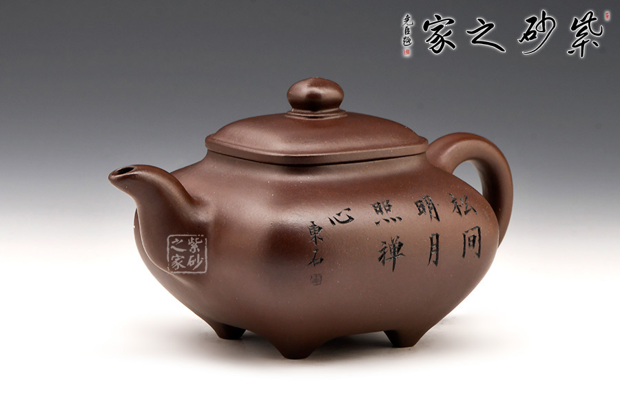 紫砂史上,四方传炉壶出现最频繁的时期当在清末民初,其后渐渐减少,直到现代除了偶见几把之外,似乎不易再见新作(大批货除外)。由于民国初年,紫砂陶器盛行以陶刻装饰,加上四脚猪的壶身宽广,提供了书画铭刻的最佳空间,所以传世的民初四脚猪几乎有七成以上,器身都饰有书画铭刻。常见的手法是一侧刻上人物、花鸟、山水等《芥子园画谱》中的国画图案,另一侧则刻上行书、草书、隶书等诗词、短句,或刻以钟鼎石刻拓本、博古图录等古趣盎然的图样。执刀者如东溪、跛陶、岩如、石生、缶硕等,相信都是老壶友熟悉的民初紫砂陶刻名手。