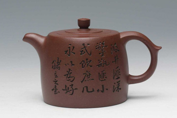 艺术应该是能给人们精神上赏心悦目的享受,给人们借某一物体以联想的空间,这个空间愈大,其艺术水准必然愈高。那么,紫砂壶艺是什么呢?紫砂壶艺不是现代陶艺,它首先受功能需求的制约,也就是说,要能作泡茶之用。在泡茶时能领略美感,又能为大多数人喜欢。紫砂壶艺是集实用、欣赏、把玩三种功能于一体 的艺术,又是能包容吸收陶文化、茶文化及书法、绘画等多种传统文化于一体的艺术载体。书画艺术欣赏性很强,但缺乏日用性、把玩性,玉雕艺术具有欣赏性、把玩性,但缺乏实用性,起码不是大多数人的日用品。紫砂艺术不同,既有很高的欣赏价值,又能在使用中把玩、欣赏,既有适用美感,又有视觉美感,亦有把玩抚摸 的触摸美感。这种艺术,可能世界上是独一无二的,起码不多见。紫砂艺术自身的、客观存在的高、中、低三个层次,又有很大的适应性,能为众多的人所接受。