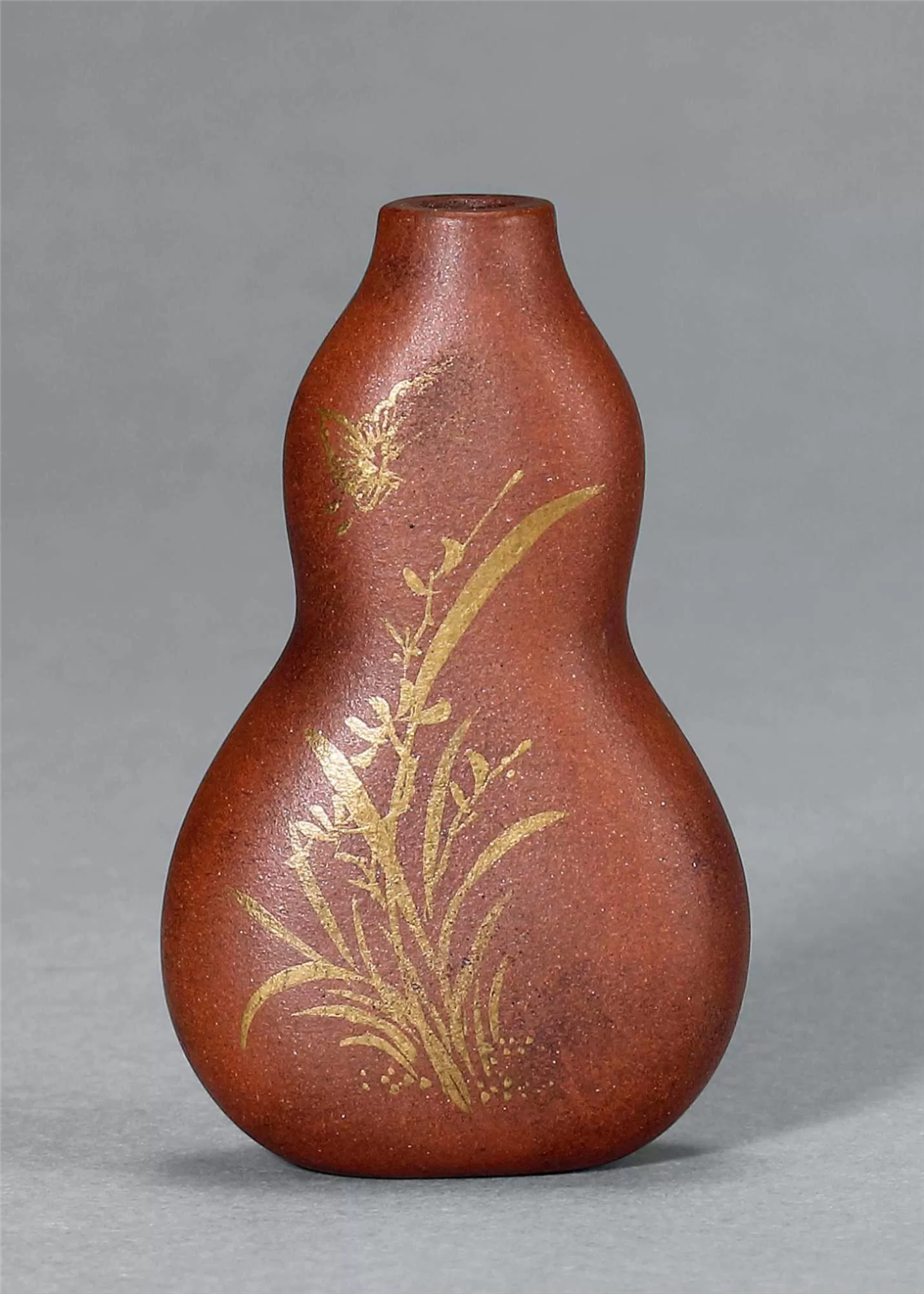 1113 清 味泉款紫泥描金兰花蝶图葫芦形鼻烟壶