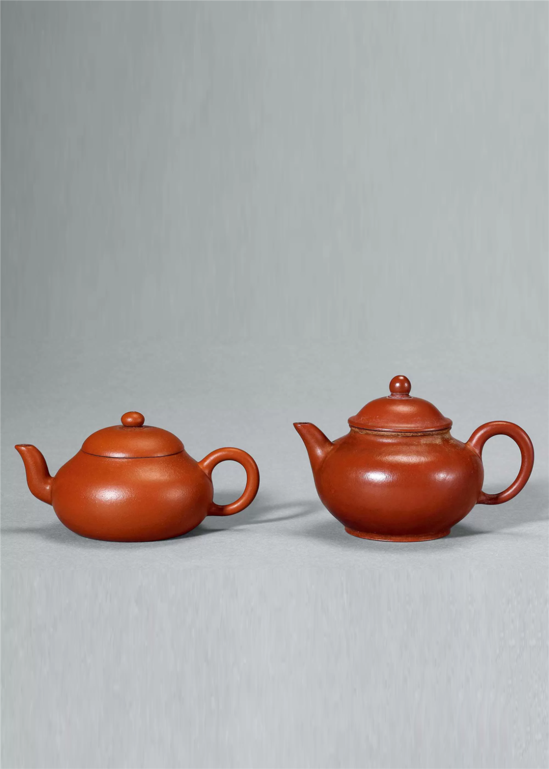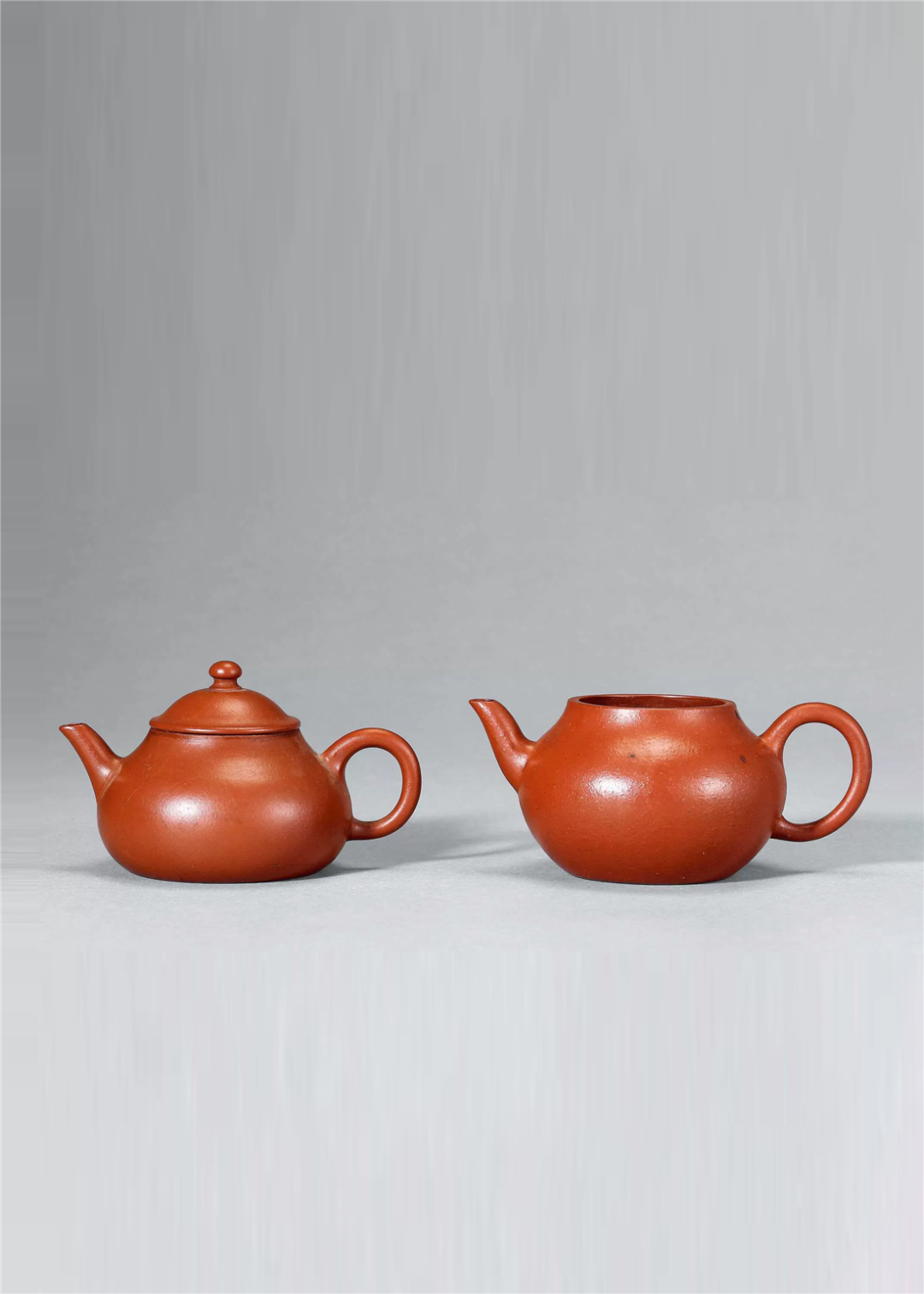 1128 清 佐茶佑玉款朱泥笠帽壶、清德堂款朱泥壶(身筒) (共两把)