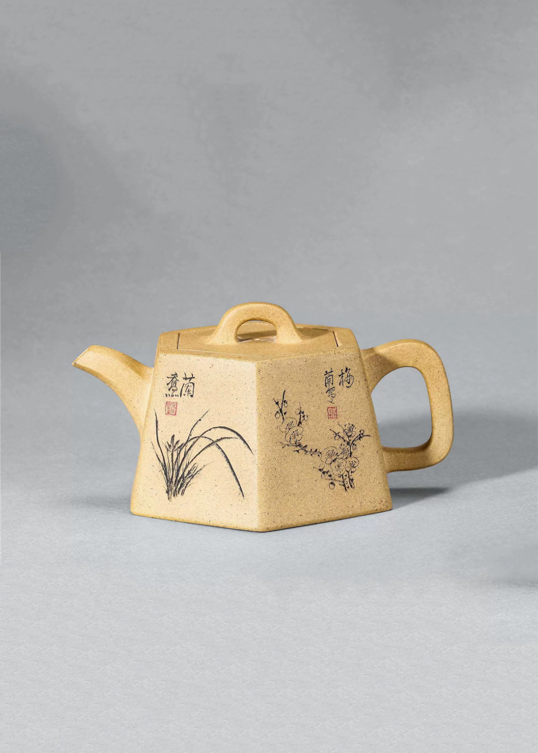 1176 当代 曹简楼、乔木、钱行健、龚继先合作“梅兰竹菊”段泥六方壶
