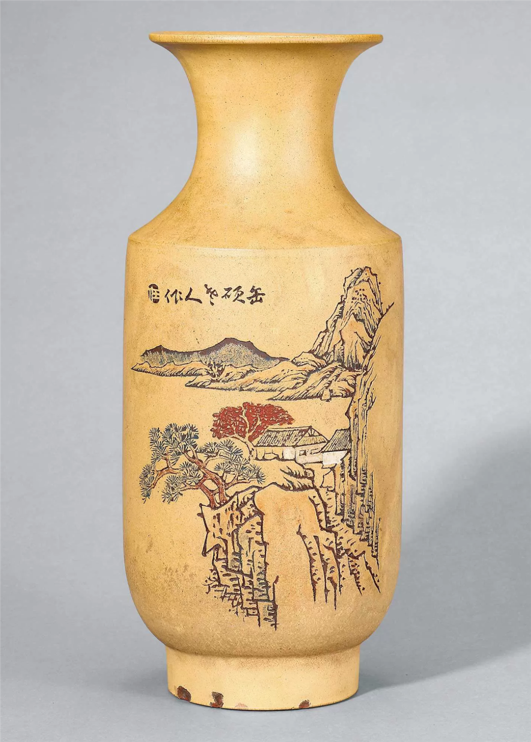 1120 民国 任淦庭山水楼台紫砂棒槌瓶