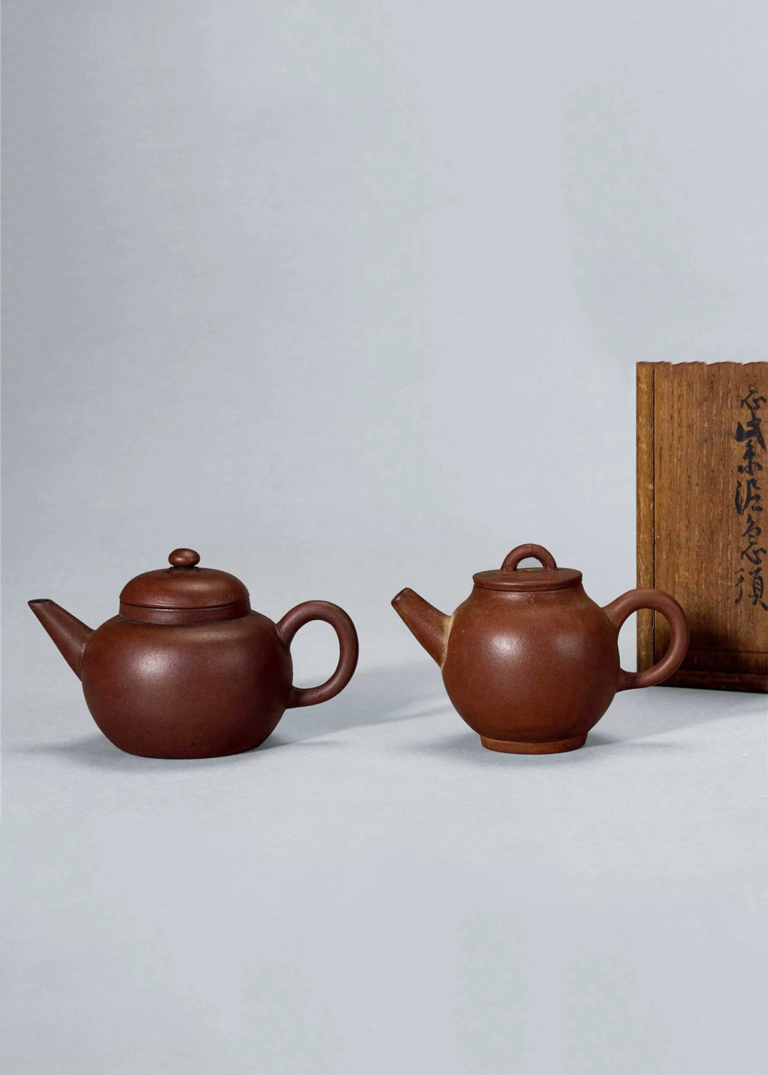 1127 清末民初 墨缘斋制紫泥水平壶、芷云款紫泥具轮珠壶 (共两把)