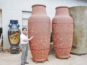紫砂之家讯:一对高3米、口径086米、腹径128米、自重各1吨,通体陶刻220位宜兴历史文化及陶艺名人名录印款的巨型紫砂陶花瓶,经4个多月的精心制作,日前在宜兴古陶丰均陶艺术研究所…详情>