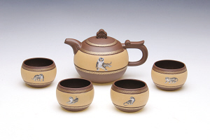 近日,一套五福临门紫砂套具一壶四杯,由当代著名紫砂人葛军设计。壶体通润,壶身为圆形,寓意富足、圆满和团圆。壶嘴、钮、把为吉祥纹案雕饰,加之壶身圈围的祥云金色纹案,象征吉祥如意。壶体…详情>