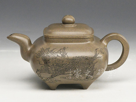 藏龙:威风凛凛的巨龙装饰壶身,龙尾从壶的另一面出,若隐若现,仿若龙的身体都被困在壶里,给人无限遐想。