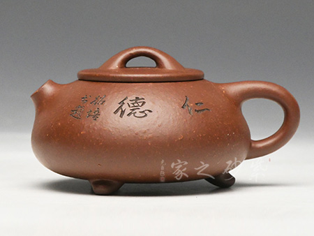 壶腹外鼓,气韵充沛,壶流三弯,线条流畅,壶口盖四方,棱角修圆,寓圆于方,方圆相融。