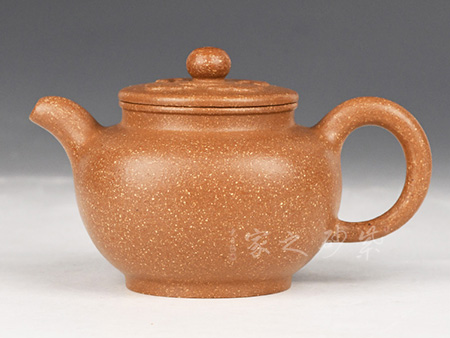 满瓢整壶线条比较饱满,底部和腹部弧度优美,连成较为圆滑的壶身,壶口较大,降低了总体重心,产生一种横向感觉。桥钮搭接在平盖之上,直流短嘴,三角把有力,略见憨态,透露几分柔美,文人气息颇浓。