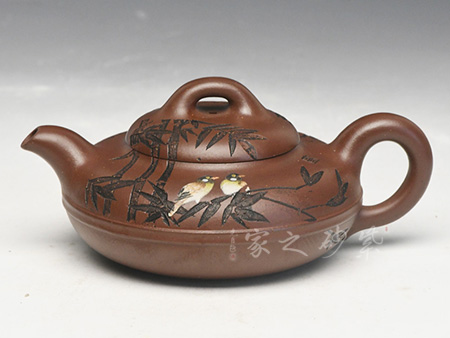 刻绘的诗句“虚心故人情,竹奏清平乐”是咏竹名句,背面的竹叶图清雅自然。该壶,是紫砂中的实用品,亦是紫砂中的艺术品,值得推荐。