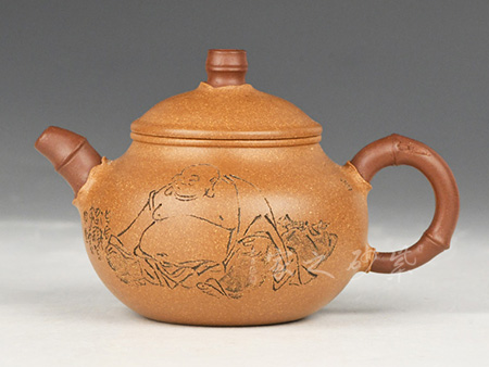 泥性:感甜嫩绵密,质坚而温润,呈近田黄色调,为江苏宜兴赵庄山系朱泥矿~黄石黄之共生矿,经挑拣练製而成,因含铁量只达6%左右,致陶之后呈“金田黄色”。