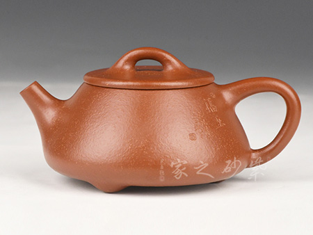特点:质感绵密、紧实细緻,持之扎实沉重、红润豔丽,泥中极品,无以伦比;泥胚含少许原矿颗粒,冲淋热水后色变极大,呈红中带紫,养壶易现“包浆”之美。