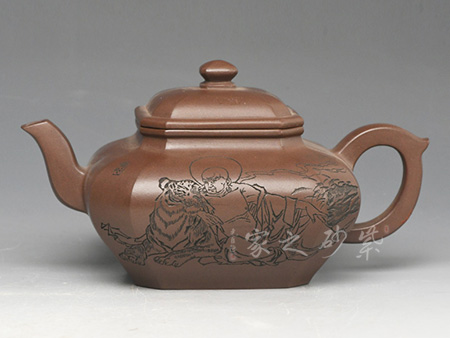 精选色黑如墨的黑泥为料,色泽神秘,引人向往。此壶壶身轮廓造型端庄周正,结构严谨,比例和谐匀称,壶身线面简洁明快,制作一丝不苟。整器亮点在于壶盖之上图案设计,以太极八卦图饰于其上,融合中国道家文化;壶嘴舒出自然,提梁贯气有力,整个造型简洁,柔中带刚,集材质美、工艺美、内容美、形式美、功能美于一体,五美齐备,神气韵皆具,堪称壶中一绝。