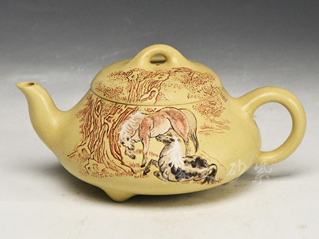 泥性:感甜嫩绵密,质坚而温润,呈近田黄色调,为江苏宜兴赵庄山系朱泥矿~黄石黄之共生矿,经挑拣练製而成,因含铁量只达6%左右,致陶之后呈“金田黄色”。