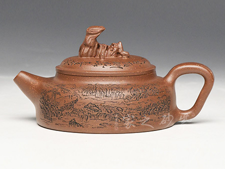 壶嘴自然伸出,微微上翘。壶体为扁圆,敦厚朴实,沉稳感较强。把柄弯曲有度,握持舒适。盖为压盖,将壶口收敛于内。壶盖上一傲首的龙头为壶钮。