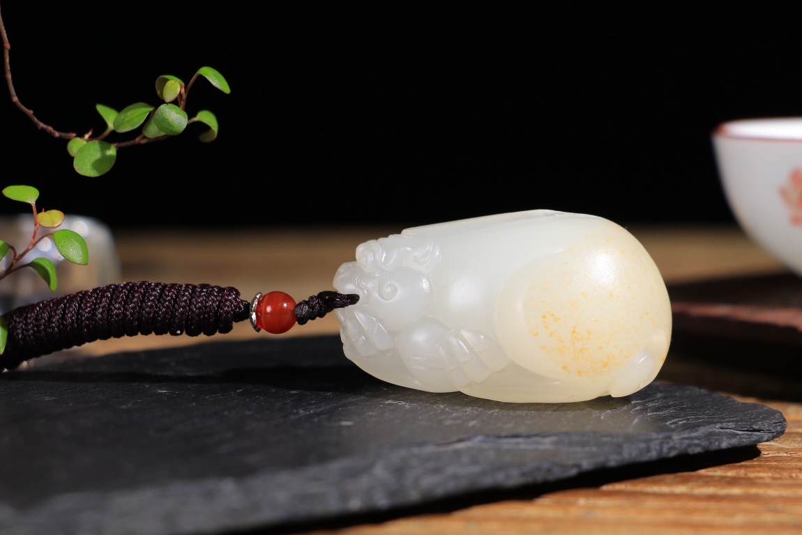 作者:精品和田玉 产地:新疆料 品类:挂件 尺寸:50.3*31.9*27.3mm 重量:63.5g 玉色:白玉 主题:貔貅