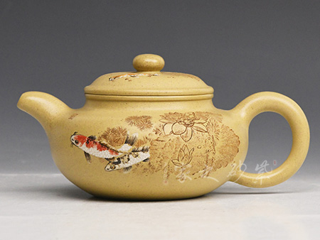 泥性:感甜嫩绵密,质坚而温润,呈近田黄色调,为江苏宜兴赵庄山系朱泥矿~黄石黄之共生矿,经挑拣练製而成,因含铁量只达6%左右,致陶之后呈“金田黄色”。