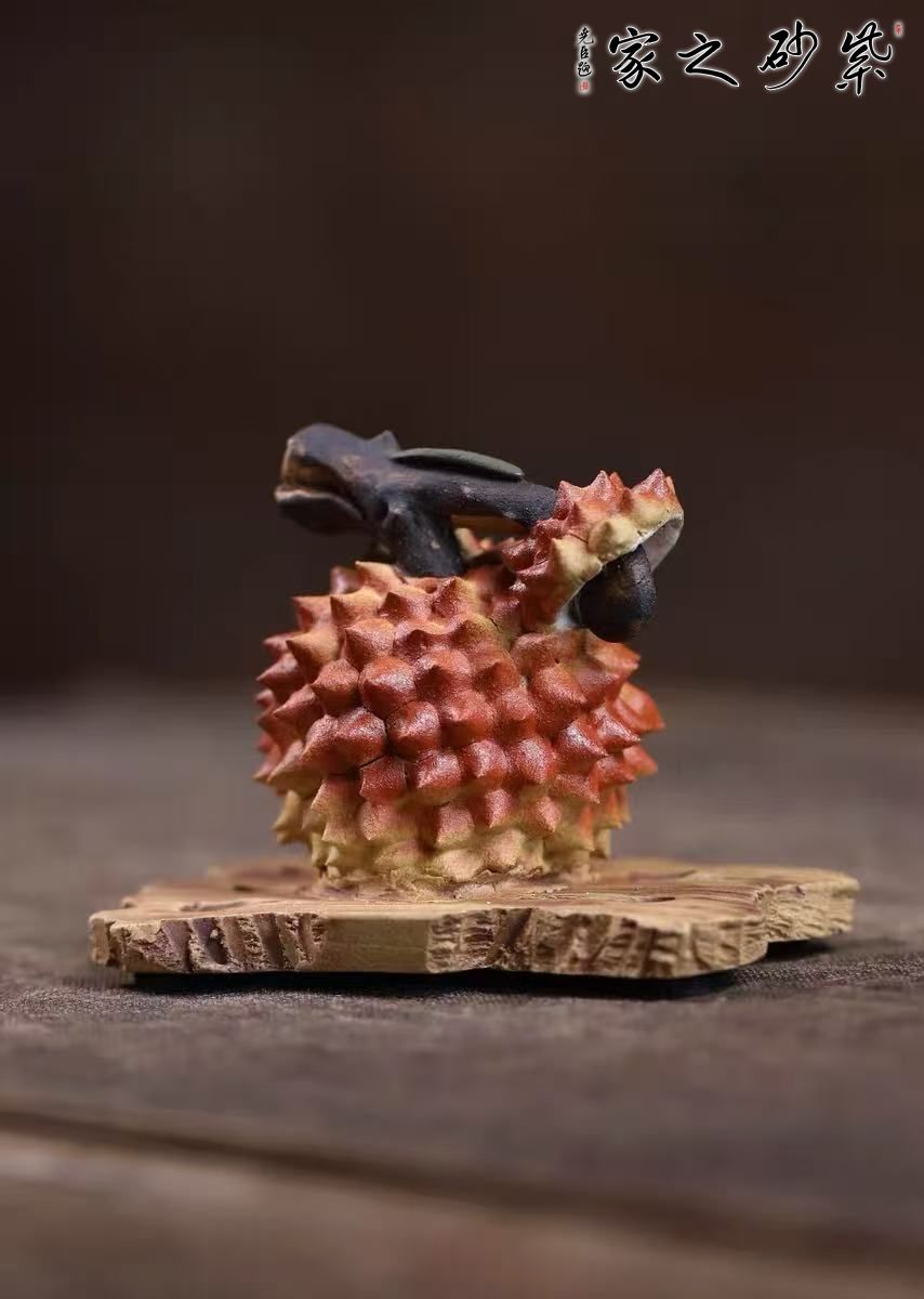 泥性:感甜嫩绵密,质坚而温润,呈近田黄色调,为江苏宜兴赵庄山系朱泥矿~黄石黄之共生矿,经挑拣练製而成,因含铁量只达6%左右,致陶之后呈“金田黄色”。