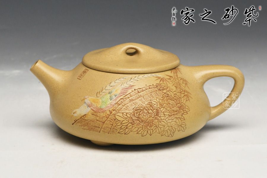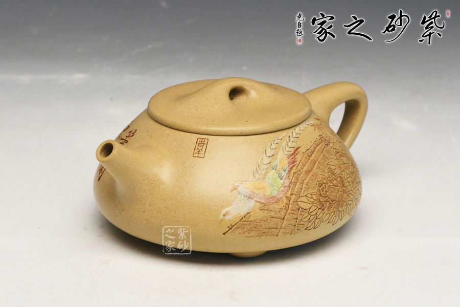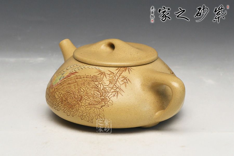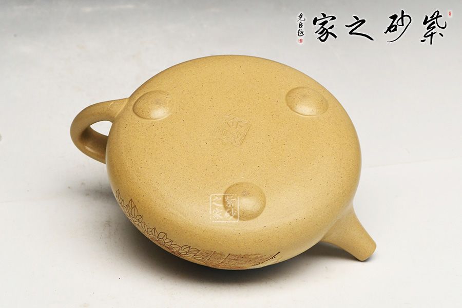 泥性:感甜嫩绵密,质坚而温润,呈近田黄色调,为江苏宜兴赵庄山系朱泥矿~黄石黄之共生矿,经挑拣练製而成,因含铁量只达6%左右,致陶之后呈“金田黄色”。