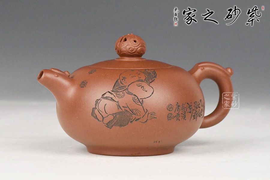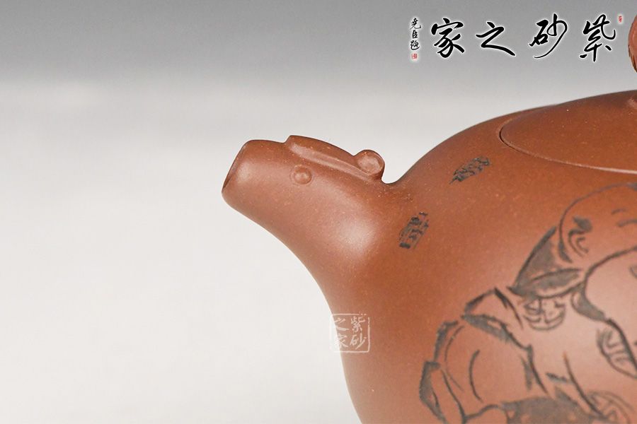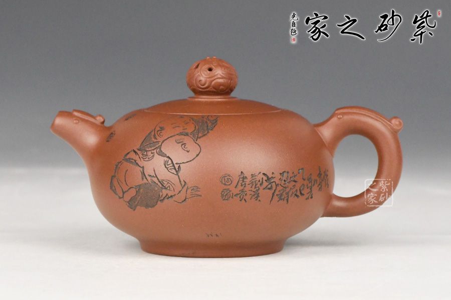 陶刻自成一派从艺二十余载,何忍群逐渐形成了自己的风格和特色。制壶技巧娴熟精湛之外,更以精致的刻绘技艺深得众多藏家的喜爱和追捧。自幼研习书画积攒下的功底,使其写意风格的人物刻绘凝练飘逸、生动传神。人物多以古代老生和美女为主,古色古香,成为收藏热选。