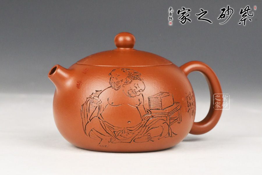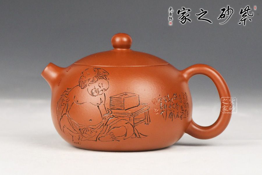 陶刻自成一派从艺二十余载,何忍群逐渐形成了自己的风格和特色。制壶技巧娴熟精湛之外,更以精致的刻绘技艺深得众多藏家的喜爱和追捧。自幼研习书画积攒下的功底,使其写意风格的人物刻绘凝练飘逸、生动传神。人物多以古代老生和美女为主,古色古香,成为收藏热选。