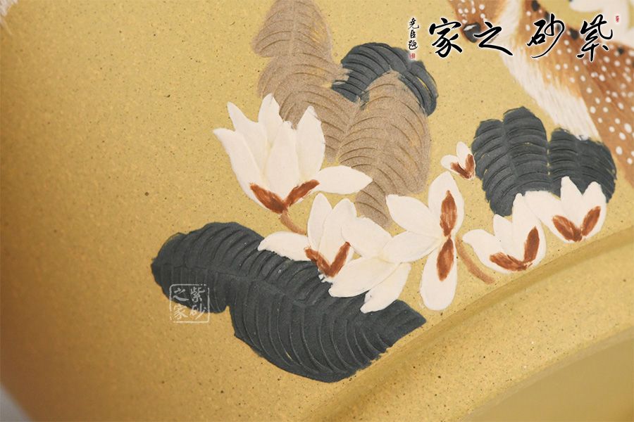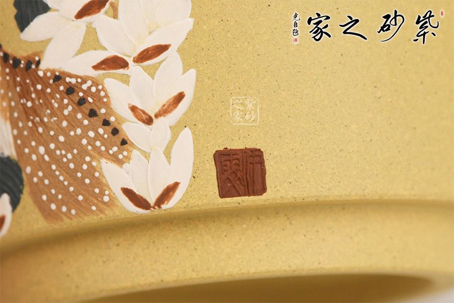 泥性:感甜嫩绵密,质坚而温润,呈近田黄色调,为江苏宜兴赵庄山系朱泥矿~黄石黄之共生矿,经挑拣练製而成,因含铁量只达6%左右,致陶之后呈“金田黄色”。