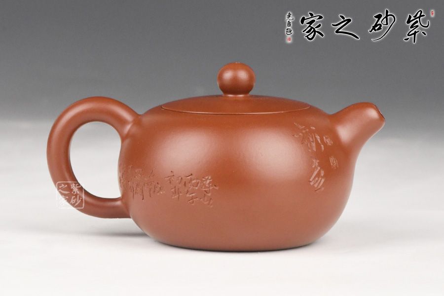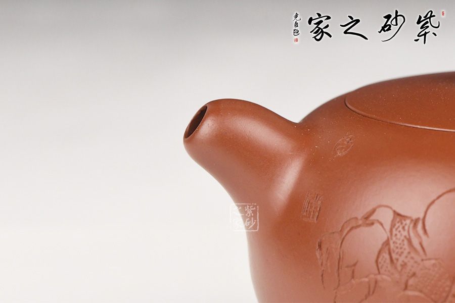 特点:质感绵密、紧实细緻,持之扎实沉重、红润豔丽,泥中极品,无以伦比;泥胚含少许原矿颗粒,冲淋热水后色变极大,呈红中带紫,养壶易现“包浆”之美。