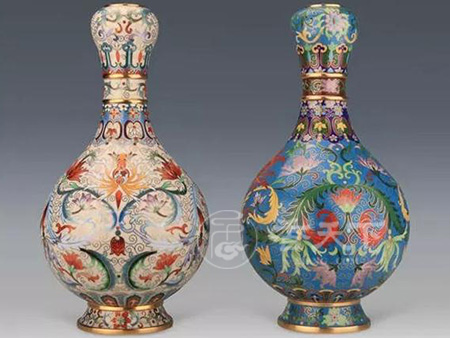 一路连升景泰蓝是为庆祝故宫诞辰600周年,以《清乾隆珐琅彩缠枝花卉蒜头瓶》为原型进行再创新,一路连升景泰蓝的整体设计赋有创新性,在规格上面远远超越原型,并且在颜色上面分为“奶油黄”和“宝石蓝”两种款式,采用皇家工艺,现代化演绎故宫经典,让文物更符合现代化意义,以此展现国宝级文物昔日的光彩,作品整体贵气逼人,浑厚浓重,满足不同人群的审美需求。 一路连升景泰蓝整体造型圆润饱满,典雅大气,周身以缠枝莲纹饰交错穿插,瑞气升腾,大胆打破原型瓷器材质,创新采用景泰蓝形式,瓶口呈蒜头状,长颈,溜肩,硕腹,圈足。瓶内壁及圈足内施绿釉。通体以金彩绘锦纹为地,其上以珐琅彩绘各式缠枝花卉,色彩艳丽。口、足、颈部饰以多道金彩,愈显金碧辉煌,华贵典雅,底部为篆书字体“乾隆年制”印章款。