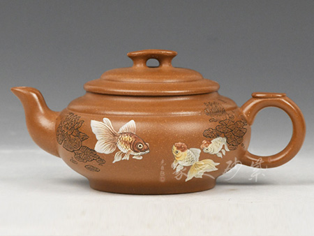 此壶三弯嘴细长流畅,宝珠钮于压盖之上,壶身饱满圆润,为了提拿方便,在肩部两端连以半月形提梁,以代替圈把。